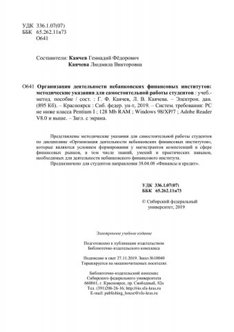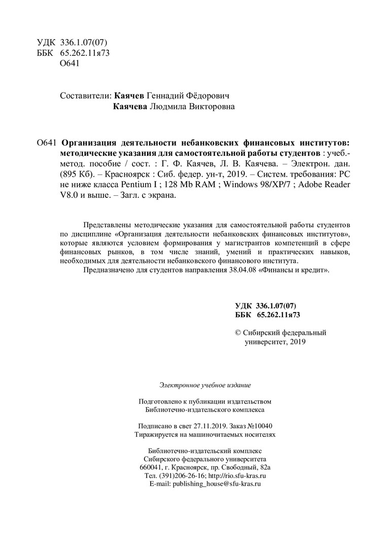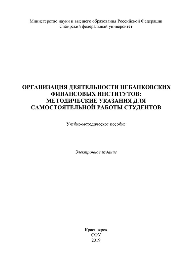 Библиографическое описание:Организация деятельности небанковских финансовых институтов: методические указания для самостоятельной работы студентов : учебно-методическое пособие / Сиб. федер. ун-т, Ин-т экономики, упр. и природопользования ; сост.: Г. Ф. Каячев, Л. В. Каячева. - Электрон. текстовые дан. (pdf, 0,8 Мб). - Красноярск : СФУ, 2019. - Загл. с титул. экрана. - Библиогр.: с. 15. - Изд. № 2019-10040 : Б. ц. - Текст : непосредственный.