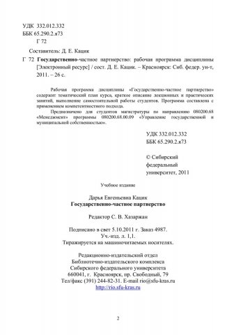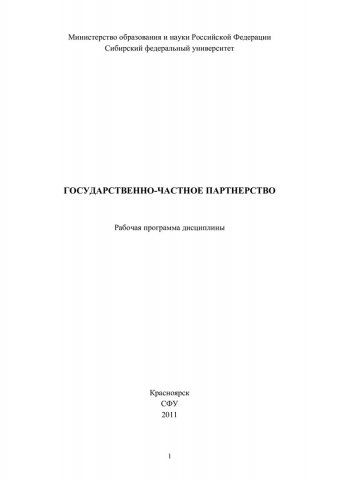 Государственно-частное партнерство : рабочая программа дисциплины / Сиб. федерал. ун-т ; сост. Д. Е. Кацик. - Красноярск : СФУ, 2011. - 24.00 р. - Текст : электронный.