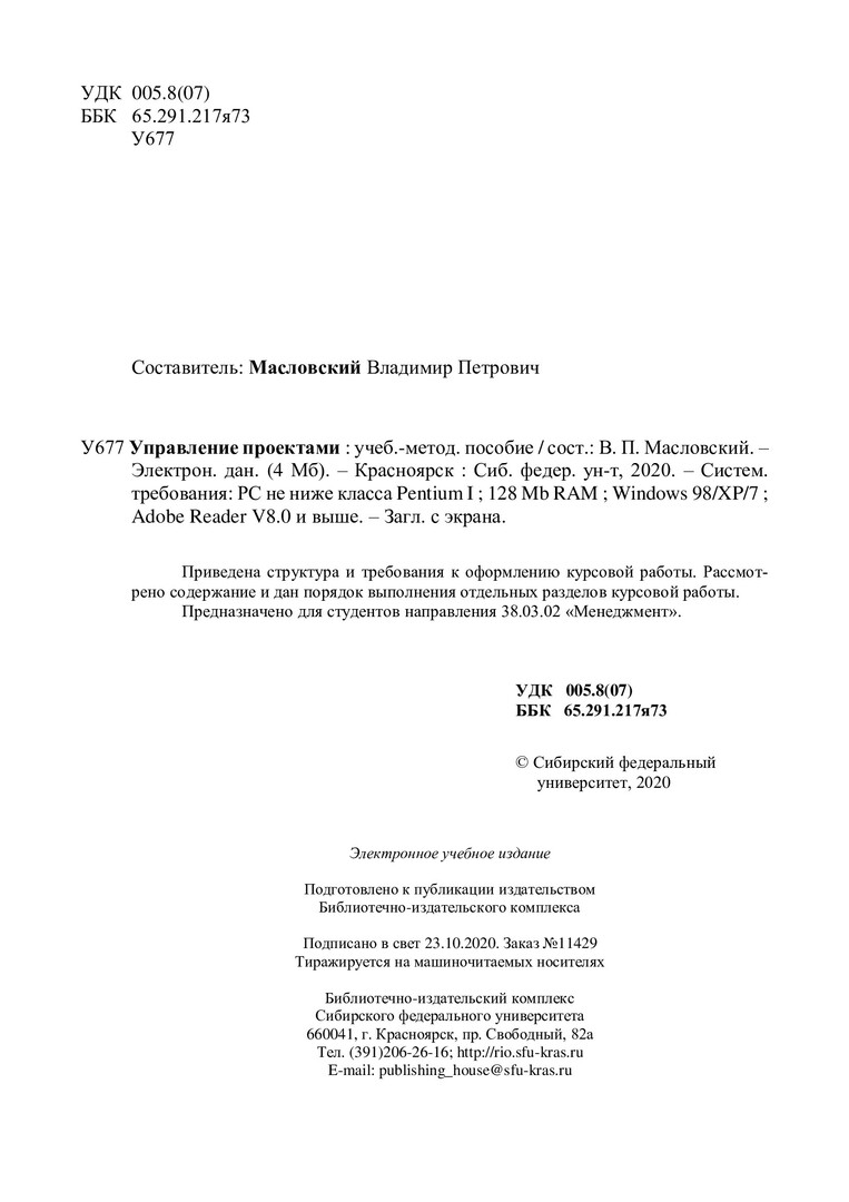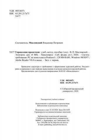 Библиографическое описание:Управление проектами : учебно-методическое пособие / Сиб. федер. ун-т, Ин-т упр. бизнес-процессами и экономики ; сост. В. П. Масловский. - Электрон. текстовые дан. (pdf, 4 Мб). - Красноярск : СФУ, 2020 (2020-06-30). - Загл. с титул. экрана. - Изд. № 2020-11429 : Б. ц. - Текст : электронный.