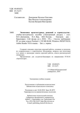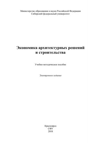 Библиографическое описание: Экономика архитектурных решений и строительства : учебно-методическое пособие / Сиб. федер. ун-т, Инж.-строит. ин-т ; сост.: Н. О. Дмитриева, Н. А. Вац, В. В. Пухова. - Электрон. текстовые дан. (pdf, 1,1 Мб). - Красноярск : СФУ, 2018. - Загл. с титул. экрана. - Библиогр.: с. 48-50. - Изд. № 2018-4872 : Б. ц. - Текст : непосредственный.