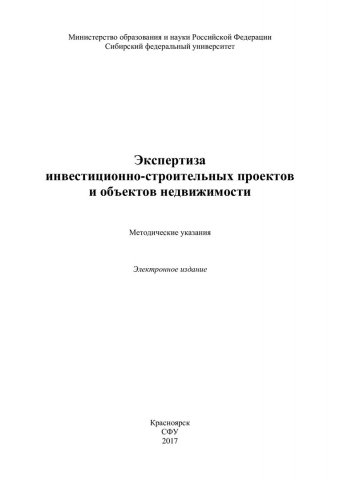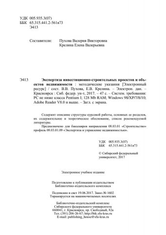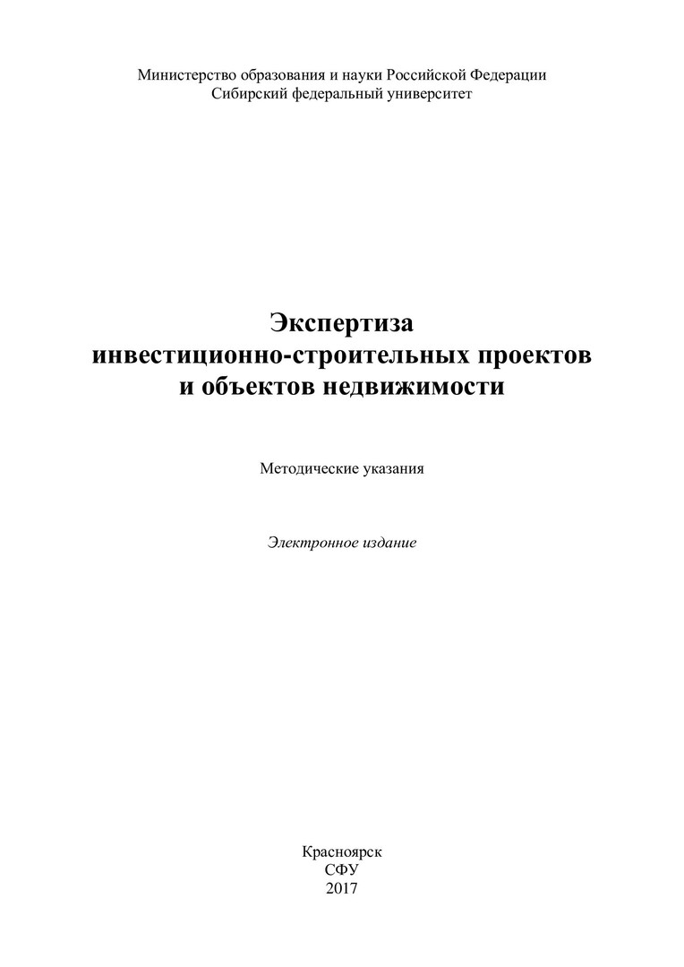 Библиографическое описание:Экспертиза инвестиционно-строительных проектов и объектов недвижимости : методические указания [для бакалавров напр. 08.03.01 «Строительство», профиля 08.03.01.09 «Экспертиза и управление недвижимостью»] / Сиб. федер. ун-т, Инж.-строит. ин-т ; сост.: В. В. Пухова, Е. В. Крелина. - Электрон. текстовые дан. (pdf, 1,2 Мб). - Красноярск : СФУ, 2017. - Загл. с титул. экрана. - Библиогр.: с. 27-38. - Изд. № 2017-1602 : Б. ц. - Текст : непосредственный.