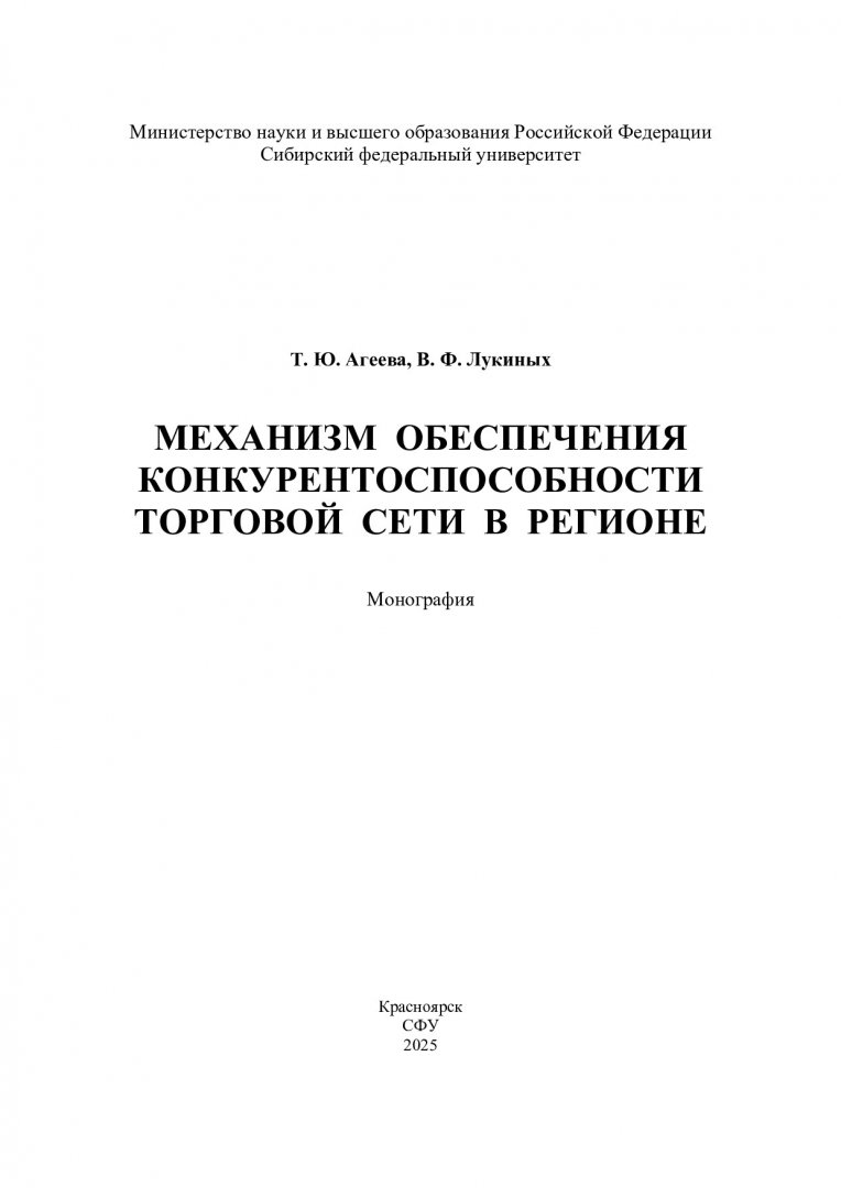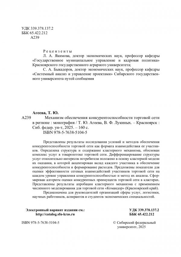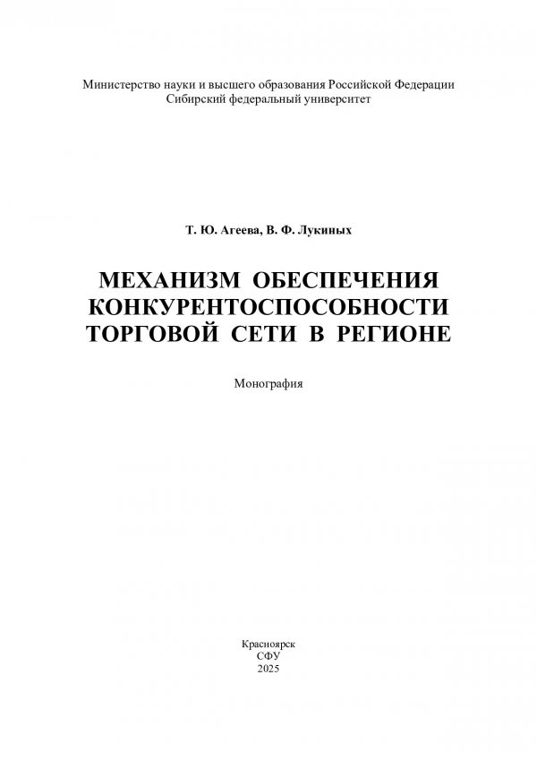Библиографическое описание: Агеева, Татьяна Юрьевна. Механизм обеспечения конкурентоспособности торговой сети в регионе : монография / Т. Ю. Агеева, В. Ф. Лукиных ; рец.: Л. А. Якимова, С. А. Быкадоров ; Сибирский федеральный университет, Институт экономики, государственного управления и финансов. - Электрон. текстовые дан. (pdf, 1.8 Мб). - Красноярск : СФУ, 2025 (2025-12-29). - 160 с., 10.0 усл. печ. л. : схемы, табл. - Загл. с титул. экрана. - Электрон. версия печ. публикации . - Библиогр.: с. 107-133. - 500 экз. - ISBN 978-5-7638-5104-5 : Б. ц. - Изд. № 2025-23862. - Текст : электронный.