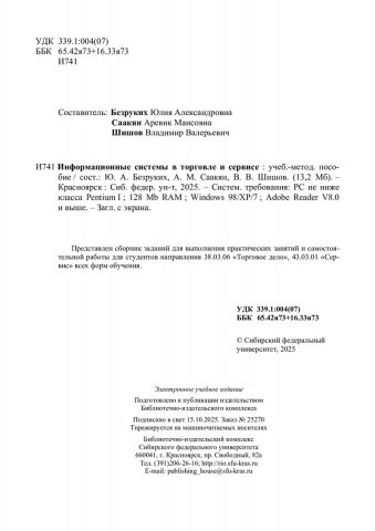 Библиографическое описание: Информационные системы в торговле и сервисе : учебно-методическое пособие / Сибирский федеральный университет, Институт торговли и сферы услуг ; сост.: Ю. А. Безруких, А. М. Саакян, В. В. Шишов. - Электрон. текстовые дан. (pdf, 2.4 Мб). - Красноярск : СФУ, 2025 (2025-10-15). - 38 с. - Загл. с титул. экрана. - Библиогр.: с. 38. - Изд. № 2025-25270 : Б. ц. - Текст : электронный.