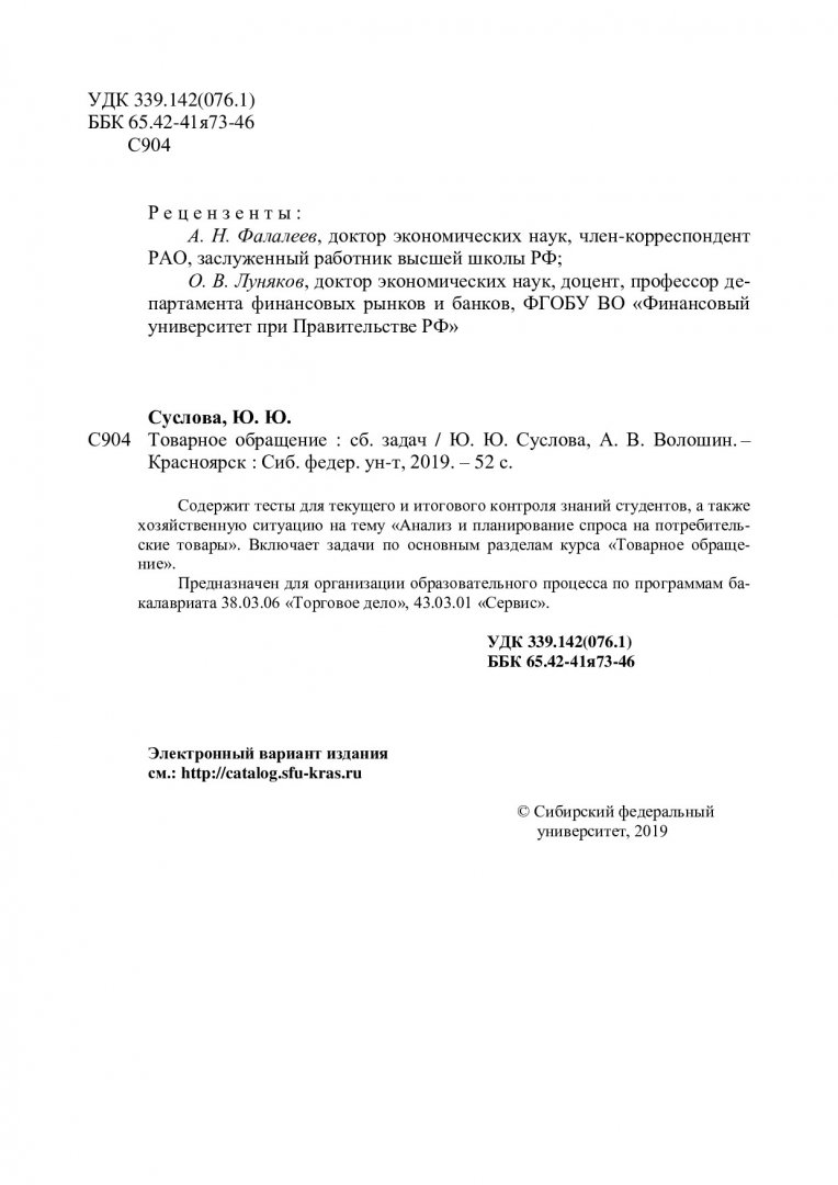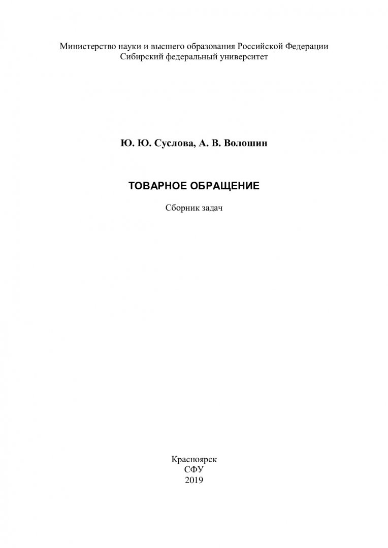 Библиографическое описание: Суслова, Юлия Юрьевна. Товарное обращение : сборник задач / Ю. Ю. Суслова, А. В. Волошин ; М-во науки и высш. образования Рос. Федер., Сиб. федер. ун-т, Ин-т торговли и сферы услуг. - Красноярск : СФУ, 2019. - 51 с. : табл. - На обл. авт. не указ. - Библиогр.: с. 49-51. - 100 экз. - Изд. № 2019-8285 : 80.00 р. - Текст : непосредственный : электронный + Текст : электронный.