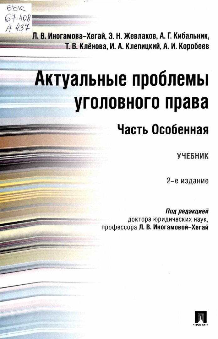 Библиографическое описание: Актуальные проблемы уголовного права. Часть Особенная = Current Problems of Criminal Law. Special Part : учебник / Л. В. Иногамова-Хегай, Э. Н. Жевлаков, А. Г. Кибальник [и др.] ; под ред. д-ра юрид. наук, проф. Л. В. Иногамовой-Хегай. - Изд. 2-е, перераб. и доп. - Москва : Проспект, 2022. - 229 с. - Парал. тит. л. на англ. яз. - Библиогр. в конце параграфов. - 500 экз. - ISBN 978-5-392-37241-6 (в пер.) : 300.00 р. - Текст : непосредственный. Электронная версия книг на сайте www.prospekt.org