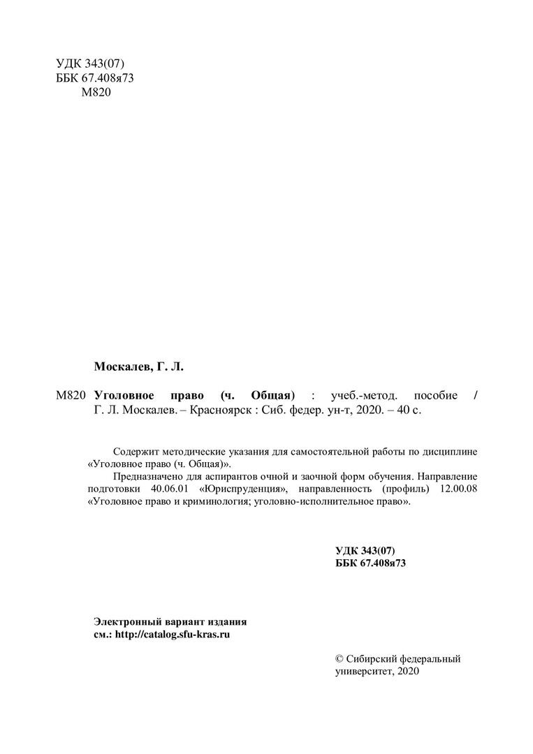Библиографическое описание:Уголовное право (часть общая) : учебно-методическое пособие / Сиб. федер. ун-т, Юрид. ин-т ; сост. Г. Л. Москалев. - Красноярск : СФУ, 2020. - 36 с. - Библиогр.: с. 32-33. - 100 экз. - Изд. № 2020-12110 : 62.00 р.