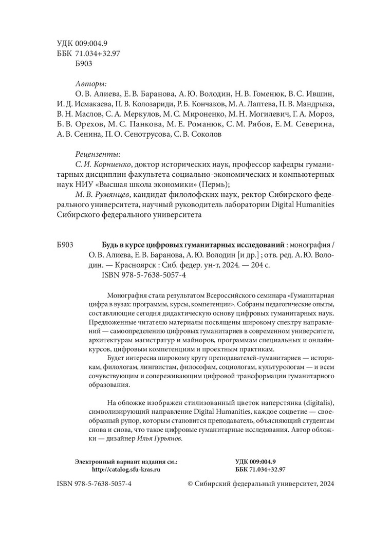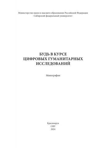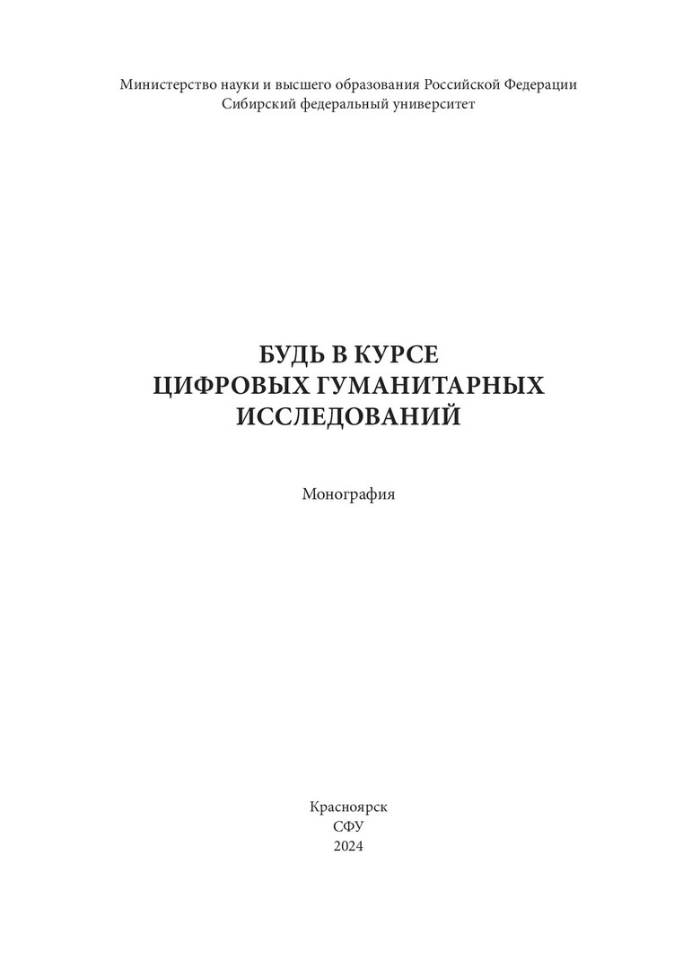 Библиографическое описание: Будь в курсе цифровых гуманитарных исследований : монография / А. Ю. Володин, О. В. Алиева, Е. В. Баранова [и др.] ; рец.: С. И. Корниенко, М. В. Румянцев ; Сибирский федеральный университет, Гуманитарный институт. - Электрон. текстовые дан. (12,0 Мб). - Красноярск : СФУ, 2024 (2024-10-30). - 204 с., 12.8 усл. печ. л. : цв. ил., рис. - Загл. с титул. экрана. - Электрон. версия печ. публикации . - 500 экз. - ISBN 978-5-7638-5057-4 : Б. ц. - Изд. № 2024-22789. - Текст : электронный.