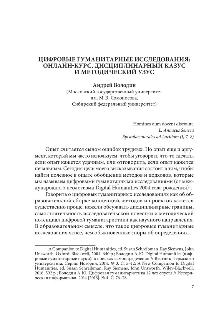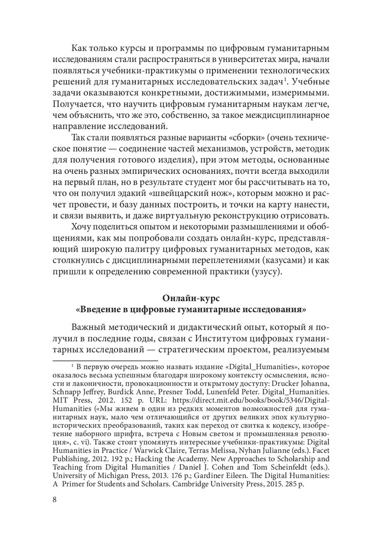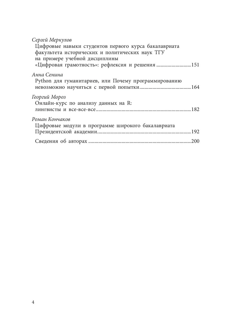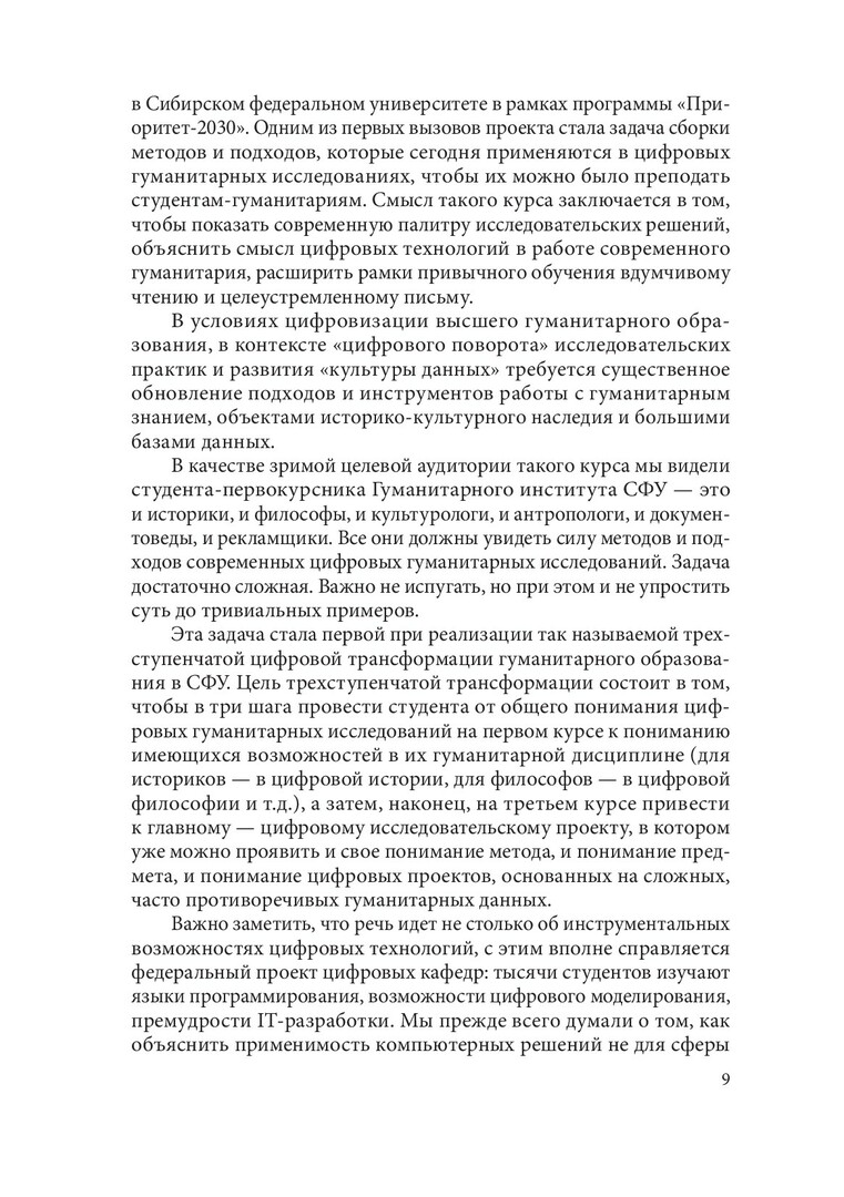 Аннотация: Монография стала результатом Всероссийского семинара «Гуманитарная цифра в вузах: программы, курсы, компетенции». Собраны педагогические опыты, составляющие сегодня дидактическую основу цифровых гуманитарных наук. Предложенные читателю материалы посвящены широкому спектру направлений — самоопределению цифровых гуманитариев в современном университете, архитектурам магистратур и майноров, программам специальных и онлайн-курсов, цифровым компетенциям и проектным практикам. Будет интересна широкому кругу преподавателей-гуманитариев — историкам, филологам, лингвистам, философам, социологам, культурологам — и всем сочувствующим и сопереживающим цифровой трансформации гуманитарного образования.