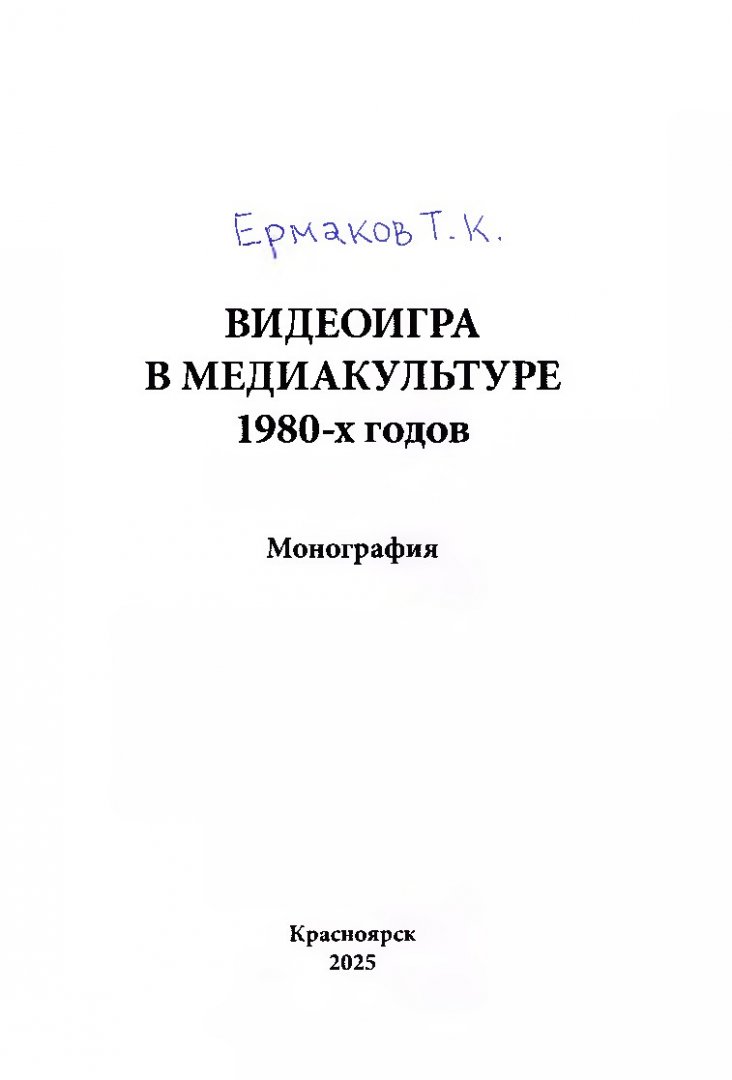 Библиографическое описание: Ермаков, Тихон Константинович. Видеоигра в медиакультуре 1980-х годов / Т. К. Ермаков ; [рец.: Н. П. Копцева, В. И. Кирко] ; Министерство науки и высшего образования Российской Федерации, Федеральное государственное автономное образовательное учреждение высшего образования "Сибирский федеральный университет", Красноярская региональная общественная организация "Содружество просветителей Красноярья". - Красноярск : [б. и.], 2025. - 123 с. - Автор на обл. не указан. - Библиогр.: с. 100-123. - 500 экз. - ISBN 978-5-6053044-2-5 (в пер.) : 115.32 р. - Текст : непосредственный.