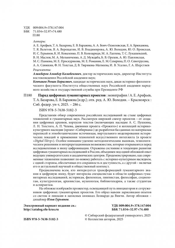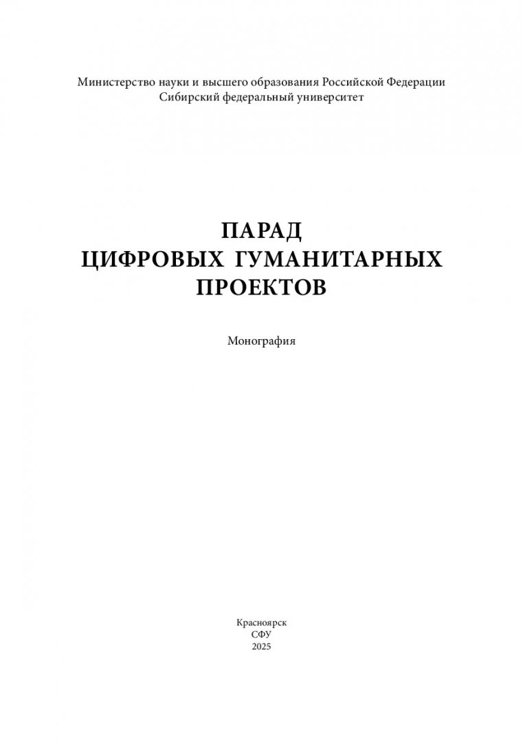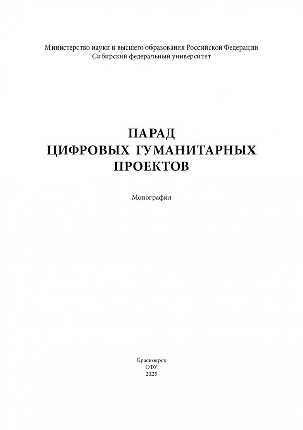 Библиографическое описание: Парад цифровых гуманитарных проектов : монография / А. Е. Арефьев, Т. А. Базарова, Е. В. Баранова [и др.] ; отв. ред. А. Ю. Володин ; Сибирский федеральный университет. - Электрон. текстовые дан. (pdf, 19.5 Мб). - Красноярск : СФУ, 2025 (2025-10-30). - 286 с., 15.0 усл. печ. л. - Загл. с титул. экрана. - Электрон. версия печ. публикации . - 500 экз. - ISBN 978-5-7638-5182-3 : Б. ц. - Изд. № 2025-25454. - Текст : электронный.