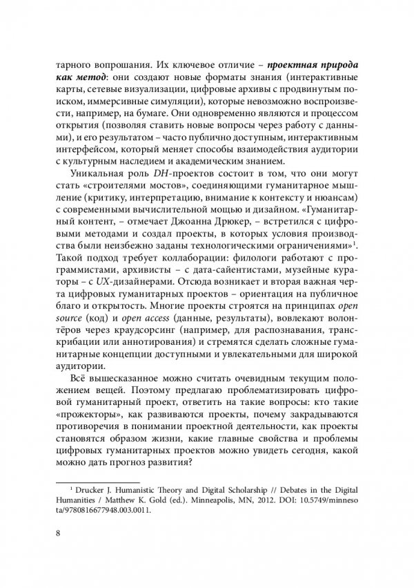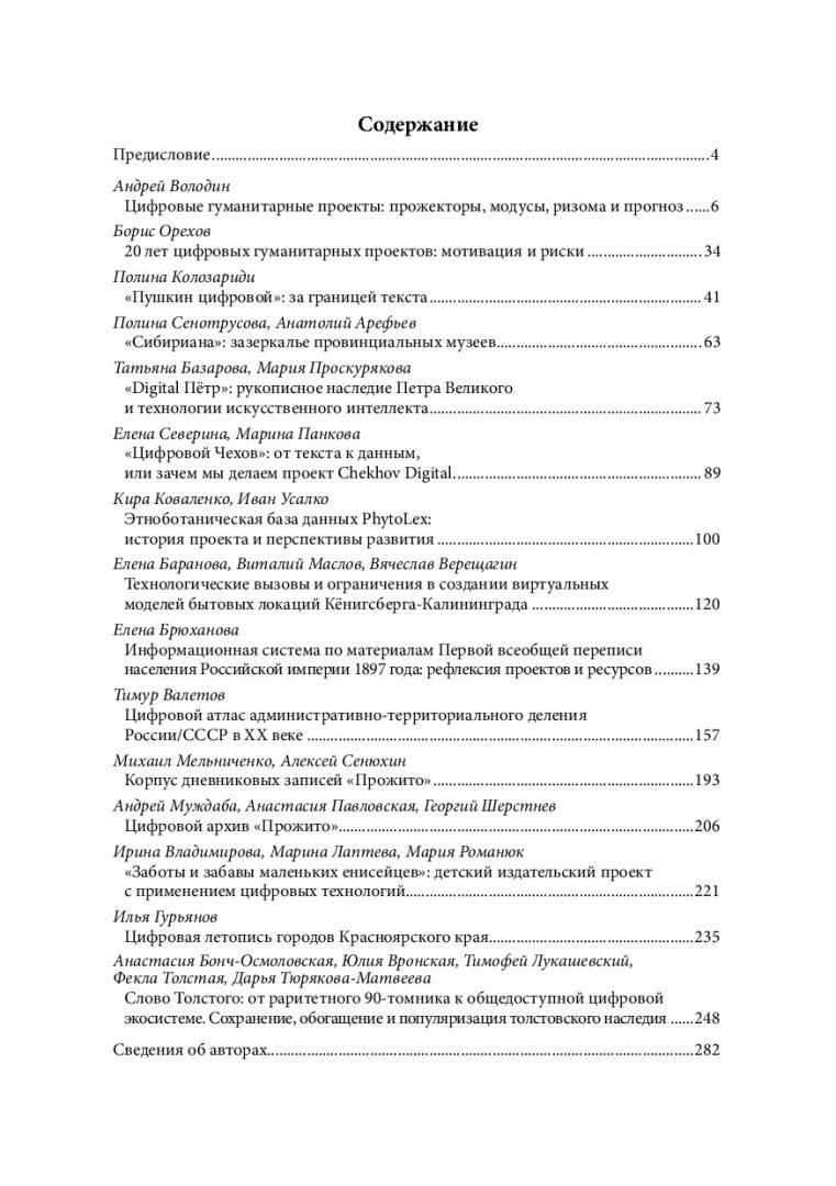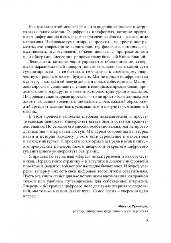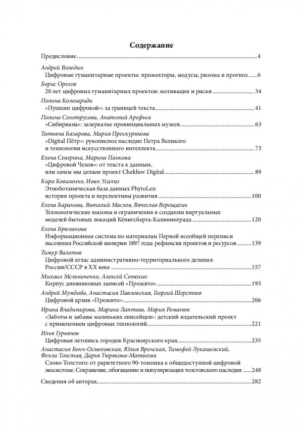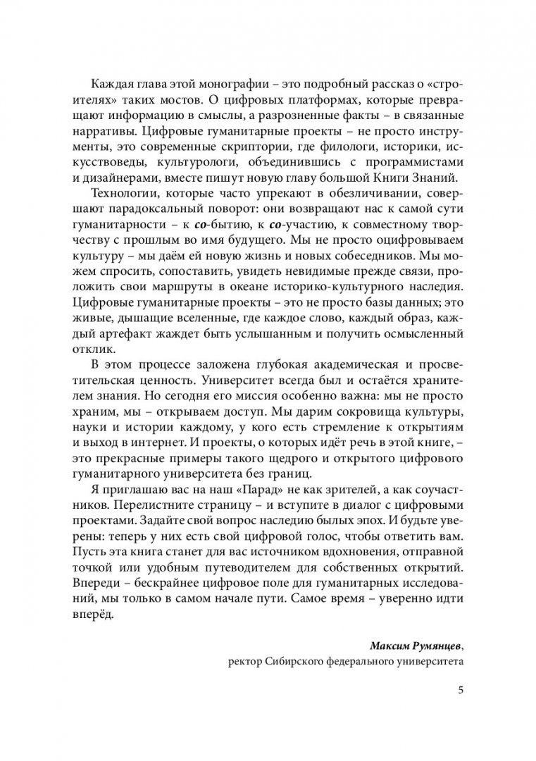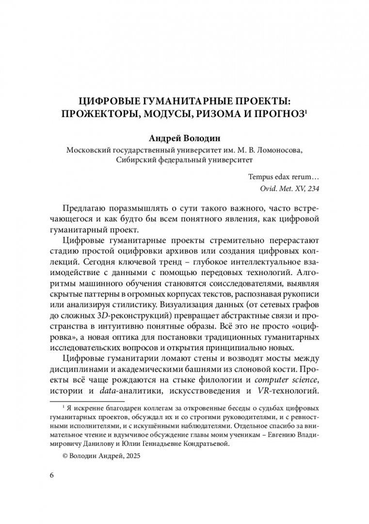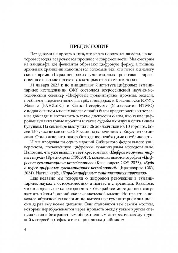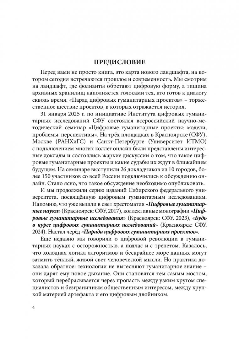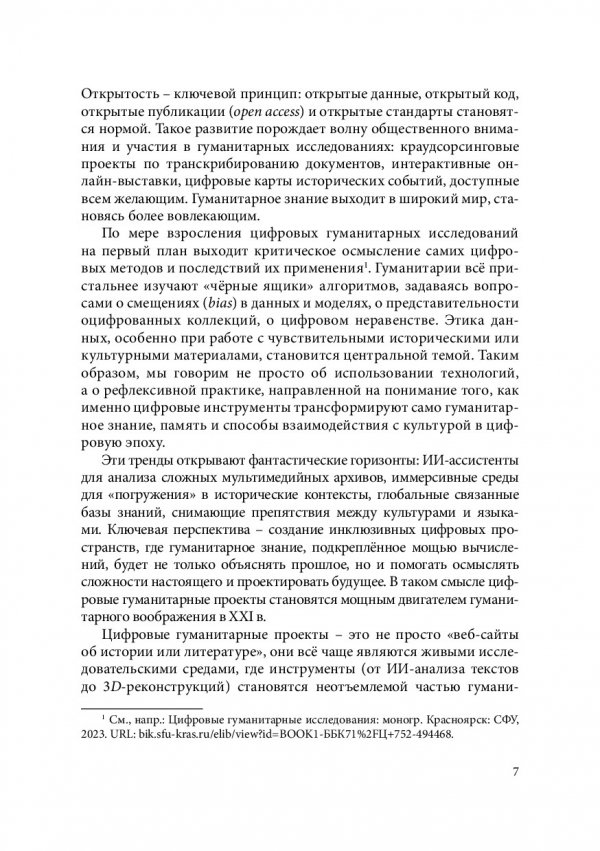 Аннотация: Представлен обзор современных российских исследований на стыке цифровых технологий и гуманитарных наук. Рассмотрен широкий спектр проектов - от создания цифровых архивов, корпусов текстов (включающих наследие А. С. Пушкина, Л. Н. Толстого, А. П. Чехова, дневники проекта «Прожито») и коллекций историко-культурного наследия (проект «Сибириана») до разработки баз данных по материалам переписей и этноботаническим источникам, виртуального моделирования исторических локаций и применения технологий искусственного интеллекта (в проекте «Digital Пётр»). Особое внимание уделено методологическим вызовам, технологическим решениям и интерпретационным возможностям, которые открываются перед исследователями в эпоху цифровизации. Отражены состояние и тенденции развития цифровых гуманитарных исследований в России, объединен под одной обложкой опыт ведущих университетских и академических центров. Продемонстрировано, как современные технологии позволяют по-новому работать с историко-культурным наследием, с одной стороны, обеспечивая его сохранность и доступность, а с другой – включая его в актуальный научный и общественный контекст. Предназначена всем, кто интересуется трансформацией гуманитарного знания в цифровую эпоху, будет интересна специалистам в области цифровых гуманитарных исследований, историкам, филологам, лингвистам, философам, социологам, культурологам, архивистам, музеологам, библиотекарям, а также студентам и аспирантам.