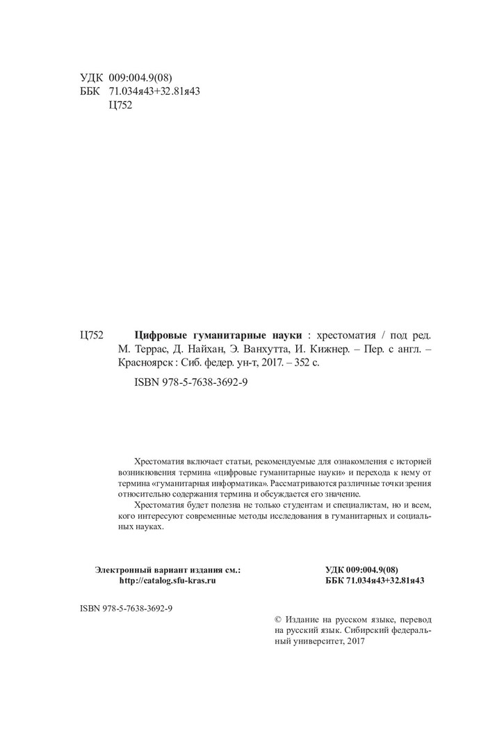 Библиографическое описание: Цифровые гуманитарные науки : хрестоматия: пер. с англ. / ред. М. Террас [и др.]. - Красноярск : СФУ, 2017. - 351 с. - Библиогр.: с. 347-350 ; Библиогр. в конце глав. - 1000 экз. - ISBN 978-5-7638-3692-9 : 220.00 р. - Изд. № 2017-1757. - Текст : непосредственный + Текст : электронный.