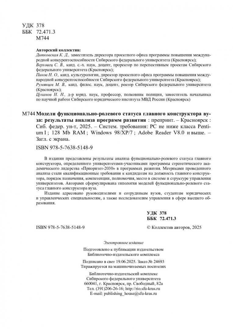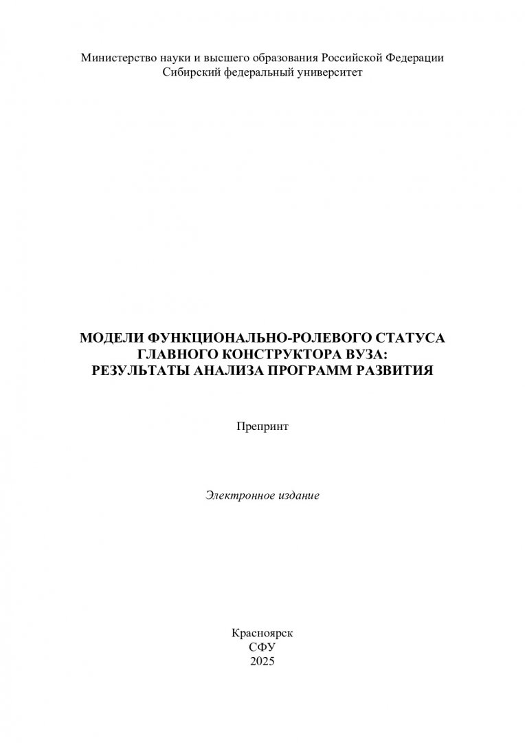 Библиографическое описание: Модели функционально-ролевого статуса главного конструктора вуза: результаты анализа программ развития : препринт / К. Д. Дитковская, С. В. Верховец, Н. О. Пиков [и др.] ; Сибирский федеральный университет. - Электрон. текстовые дан. (pdf, 2,0 Мб). - , 2025-06-19. - 24 с. - Загл. с титул. экрана. - ISBN 978-5-7638-5148-9 : Б. ц. - Изд. № 2025-24693. - Текст : электронный.