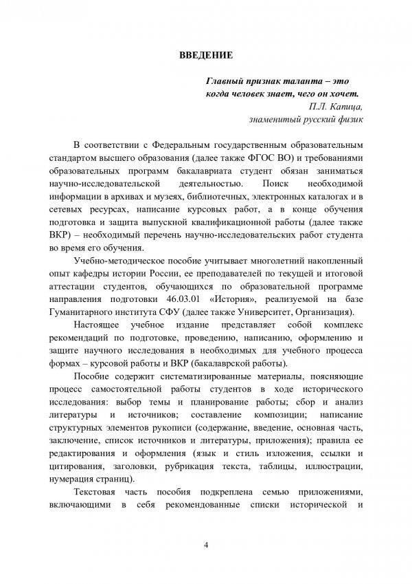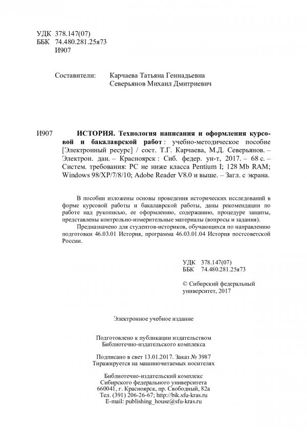 Библиографическое описание:История. Технология написания и оформления курсовой и бакалаврской работ : учебно-методическое пособие [для студентов-историков напр. подготовки 46.03.01 "История", программы 46.03.01.04 "История постсоветской России"] / Сиб. федер. ун-т, Гуманитар. ин-т ; сост.: Т. Г. Карчаева, М. Д. Северьянов. - Электрон. текстовые дан. (pdf, 0,5 Мб). - Красноярск : СФУ, 2017. - Загл. с титул. экрана. - Библиогр.: с. 53-54. - Изд. № 2016-3987 : Б. ц. - Текст : непосредственный.