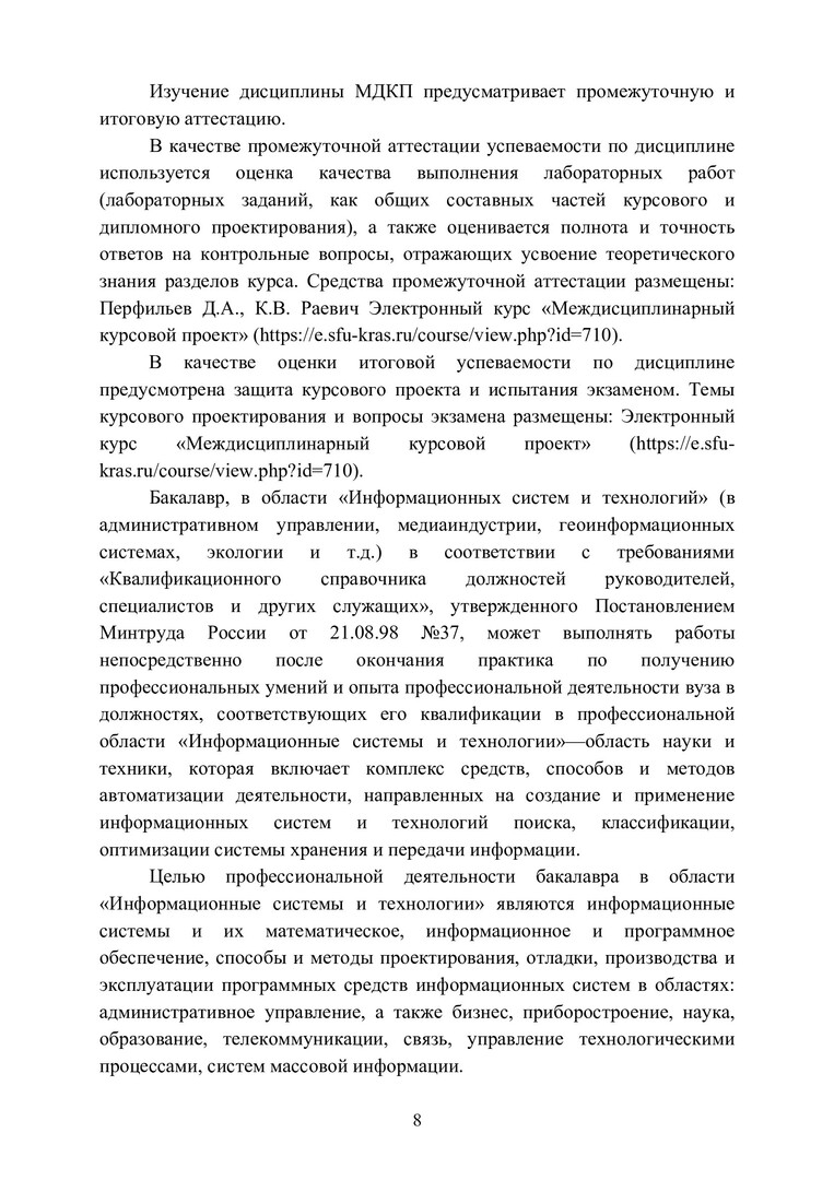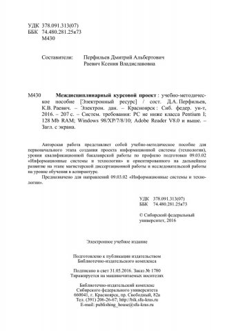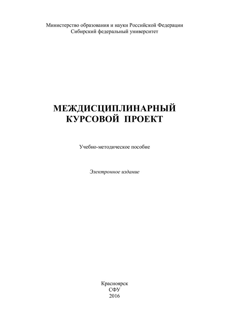 Библиографическое описание:Междисциплинарный курсовой проект : учебно-методическое пособие [для напр. 09.03.02 «Информационные системы и технологии»] / Сиб. федер. ун-т, Ин-т космич. и информ. технологий ; сост.: Д. А. Перфильев, К. В. Раевич. - Электрон. текстовые дан. (pdf, 1,62 Мб). - Красноярск : СФУ, 2016. - Загл. с титул. экрана. - Библиогр.: с. 133-137. - Изд. № 2016-1780 : Б. ц. - Текст : непосредственный.