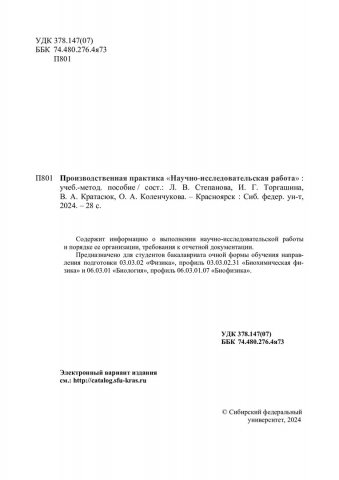 Библиографическое описание: Производственная практика «Научно-исследовательская работа» : учебно-методическое пособие / Сибирский федеральный университет, Институт фундамент. биологии и биотехнологии ; сост. Л. В. Степанова, И. Г. Торгашина, В. А. Кратасюк, Ю. А. Коленчукова. - Электрон. текстовые дан. (0,4 Мб). - Красноярск : СФУ, 2024 (2024-11-22). - 16 с. - Загл. с титул. экрана. - Электрон. версия печ. публикации . - 100 экз. - Изд. № 2024-23254 : Б. ц. - Текст : электронный.