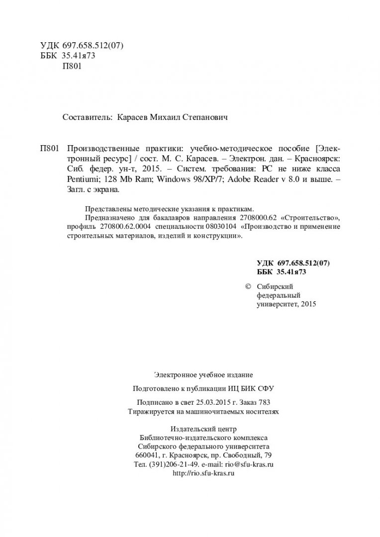 Библиографическое описание:Производственные практики : учебно-методическое пособие [для студентов профиля подг. 270800.62.0004, спец. 08030104 «Производство и применение строительных материалов, изделий и конструкции»] / Сиб. федер. ун-т, Инж.-строит. ин-т ; сост. М. С. Карасев. - Электрон. текстовые дан. (PDF, 269 Кб). - Красноярск : СФУ, 2015. - Загл. с титул. экрана. - Изд. № 2015-783. - Текст : электронный.