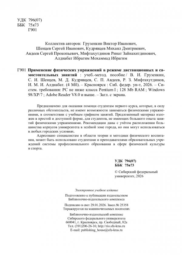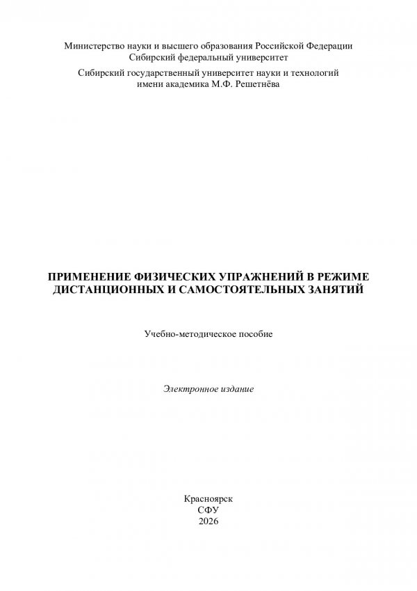 Библиографическое описание: Применение физических упражнений в режиме дистанционных и самостоятельных занятий : учебно-методическое пособие / В. И. Грузенкин, С. И. Шенцев, С. П. Авдеев [и др.]. ; Сиб. федер. ун-т, Политехн. ин-т. - Электрон. текстовые дан. (pdf, 4.3 Мб). - Красноярск : СФУ, 2026 (2026-01-29). - 36 с. - Загл. с титул. экрана. - Изд. № 2025-25358 : Б. ц. - Текст : электронный.
