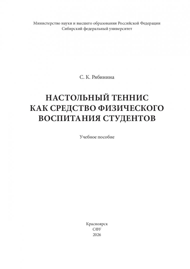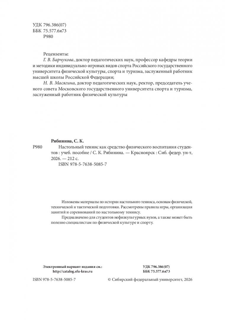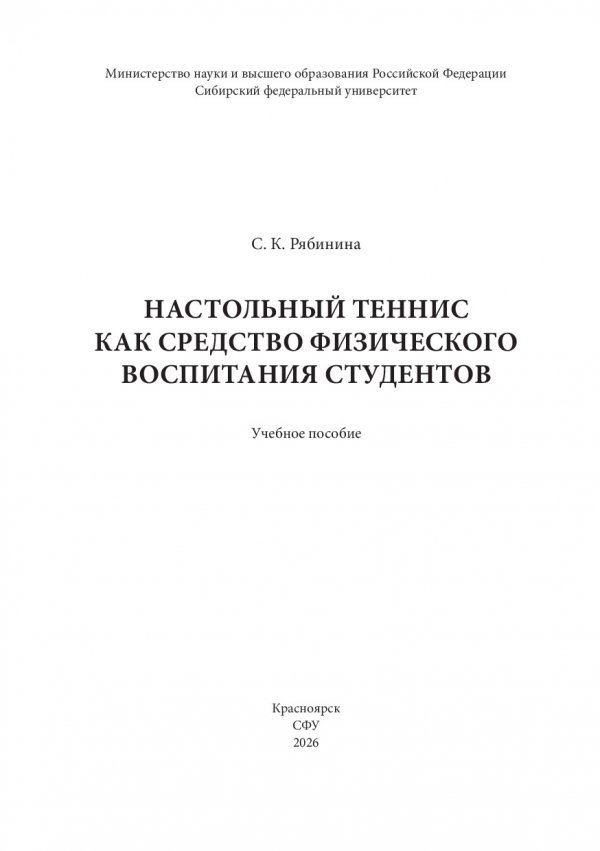 Библиографическое описание: Рябинина, Светлана Кадамбаевна. Настольный теннис как средство физического воспитания студентов : учебное пособие / С. К. Рябинина ; рец.: Г. В. Барчукова, Н. В. Масягина ; Сибирский федеральный университет, Институт физической культуры, спорта и туризма. - Электрон. текстовые дан. (pdf, 6.9 Мб). - Красноярск : СФУ, 2026 (2026-01-12). - 212 с., 13.3 усл. печ. л. : табл., цв. ил., схемы. - Загл. с титул. экрана. - Электрон. версия печ. публикации . - Библиогр.: с. 189-196. - 100 экз. - ISBN 978-5-7638-5085-7 : Б. ц. - Изд. № 2025-23638. - Текст : электронный.