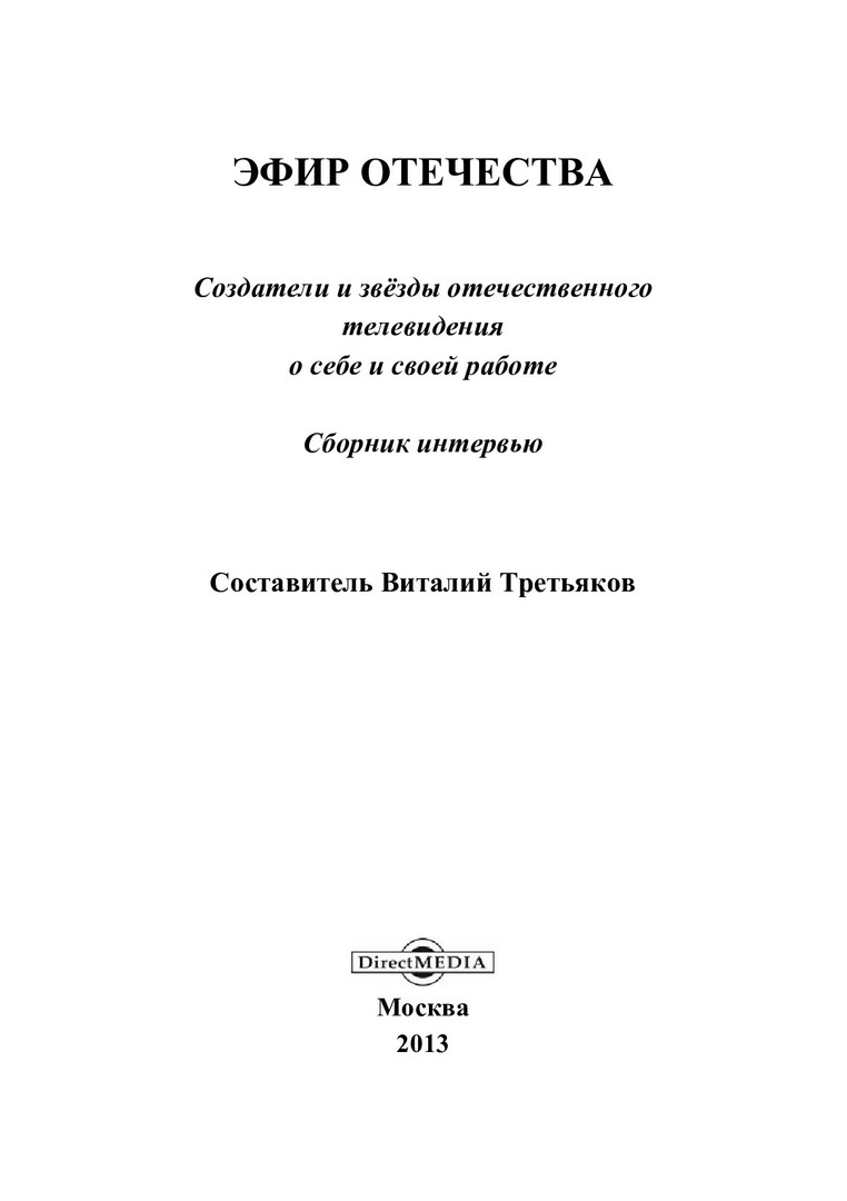 Библиографическое описание:Эфир Отечества. Создатели и звезды отечественного телевидения о себе и своей работе : сборник интервью / сост. В. Т. Третьяков. - Москва : Директ-Медиа, 2013. - Загл. с титул. экрана. - ISBN 978-5-4458-3557-8 : Б. ц. - Текст : электронный.