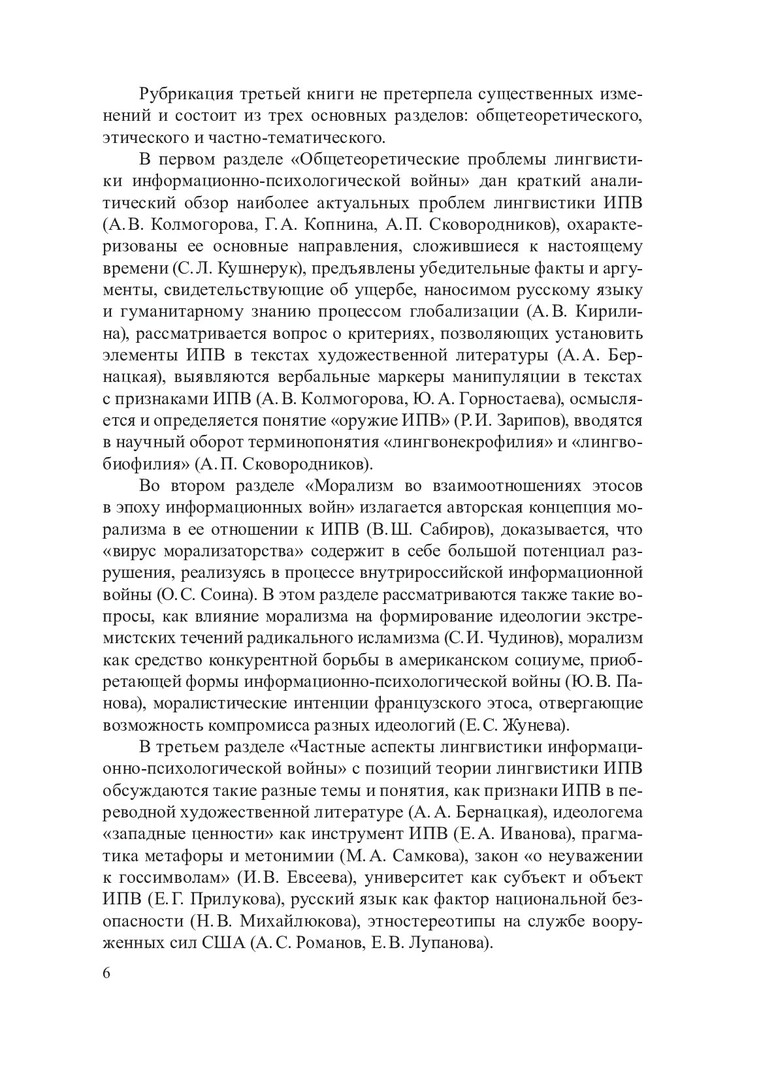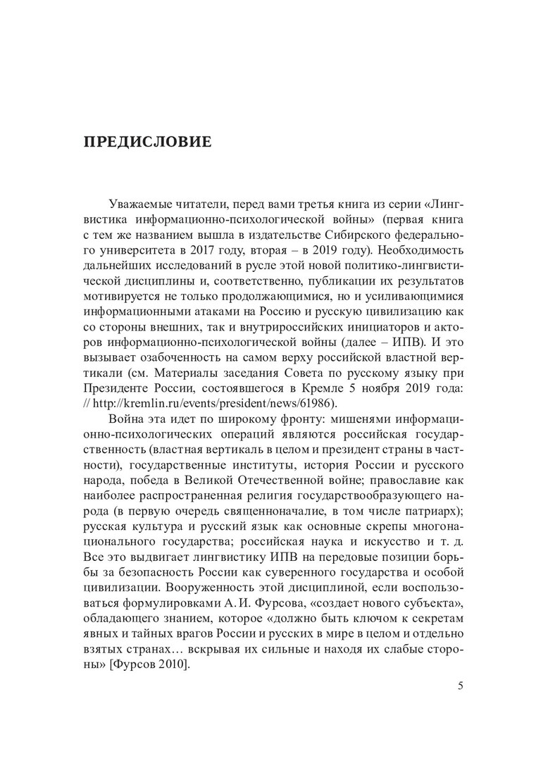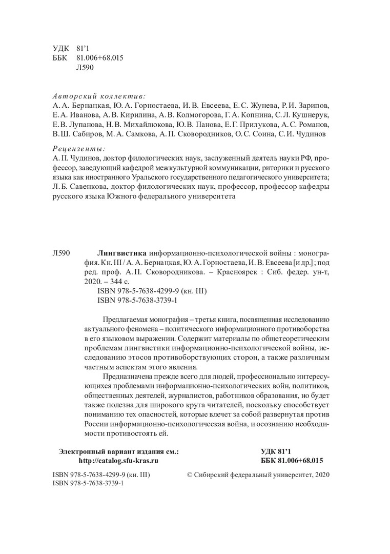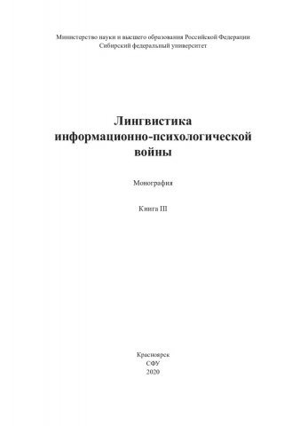 Библиографическое описание:Лингвистика информационно-психологической войны : монография / Сибирский федеральный университет, Институт филологии и языковой коммуникации; ред. А. П. Сковородников ; рец.: А. П. Чудинов, А. Б. Савенкова. - Красноярск : СФУ, 2017 - . - ISBN 978-5-7638-3739-1. - Текст : непосредственный : электронный. Кн. 3 / А. А. Бернацкая, Ю. А. Горностаева, И. В. Евсеева [и др.]. - 2020 (2020-06-30). - 344 с. - Библиогр.: с. 303-340. - 500 экз. - ISBN 978-5-7638-4299-9 : 560.00 р. - Изд. № 2019-10976
