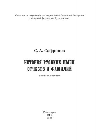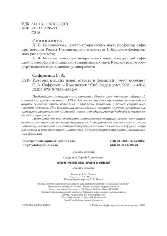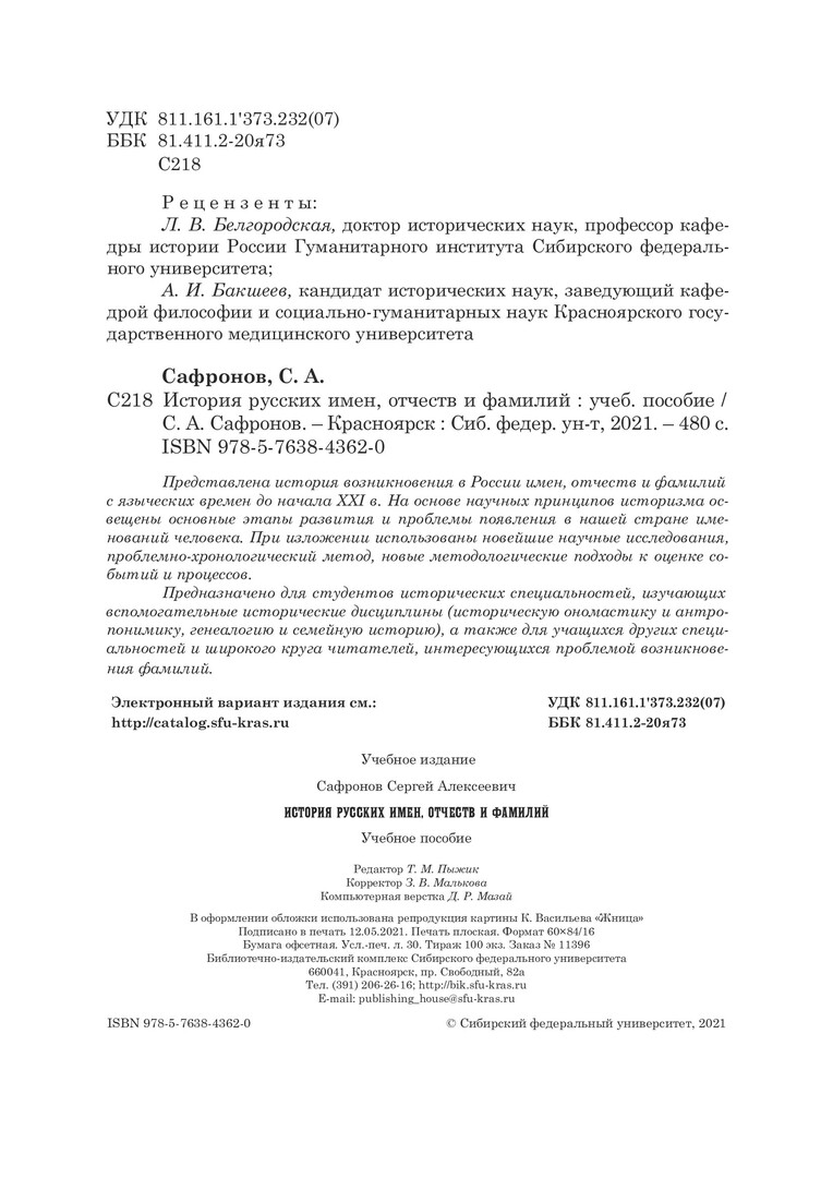Библиографическое описание: Сафронов, Сергей Алексеевич. История русских имен, отчеств и фамилий : учебное пособие / С. А. Сафронов ; Сибирский федеральный университет, Гуманитарный институт. - Красноярск : СФУ, 2021 (2020-06-10). - 480 с., 30.0 усл. печ. л. - Библиогр.: с. 469-467. - 100 экз. - ISBN 978-5-7638-4362-0 : 791.00 р. - Изд. № 2020-11396. - Текст : непосредственный + Текст : электронный.