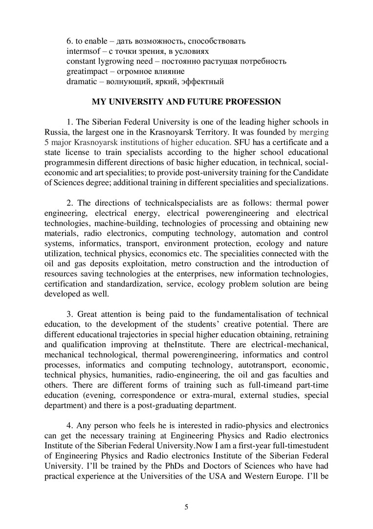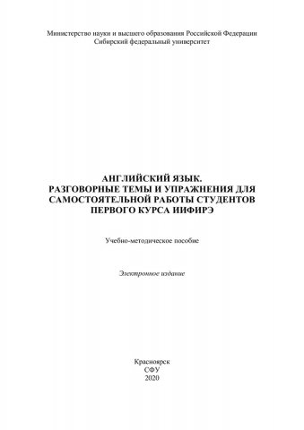 Библиографическое описание:Английский язык. Разговорные темы и упражнения для самостоятельной работы студентов первого курса ИИФиРЭ : учебно-методическое пособие / Сиб. федер. ун-т, Ин-т филологии и яз. коммуникации ; сост.: В. Г. Андюсева, С. В. Поликарпова, О. В. Шагалина. - Электрон. текстовые дан. (pdf, 0,9 Мб). - Красноярск : СФУ, 2020 (2020-03-16). - 58 с. - Загл. с титул. экрана. - Изд. № 2020-11188 : Б. ц. - Текст : электронный.