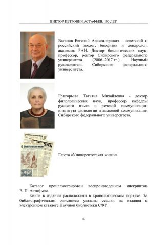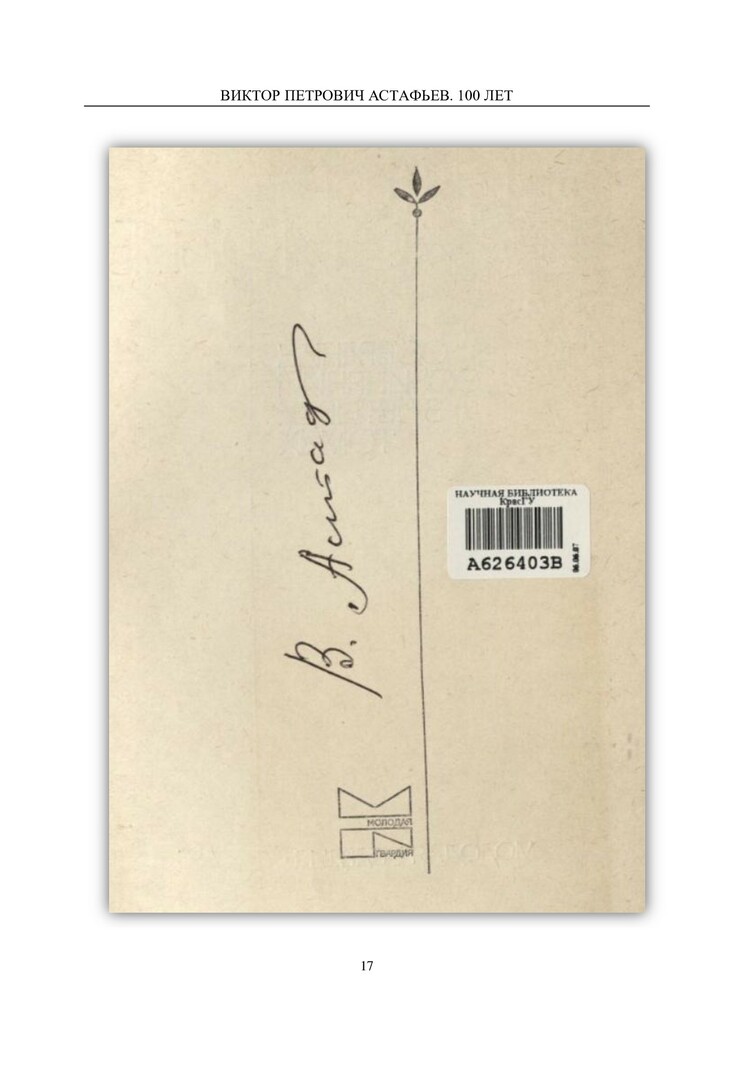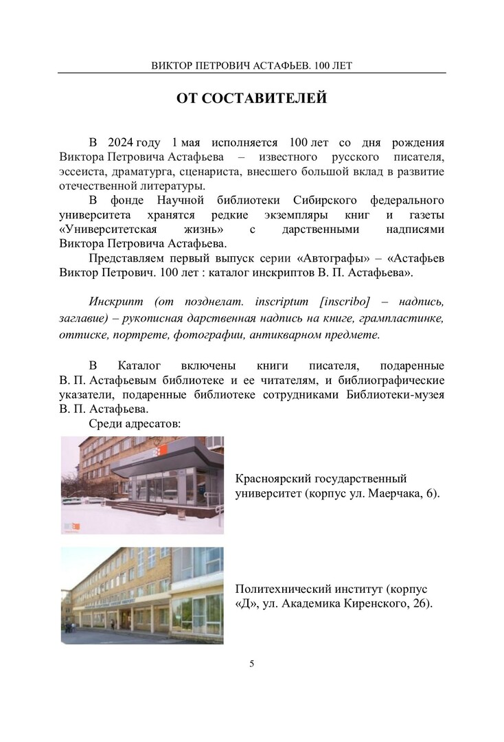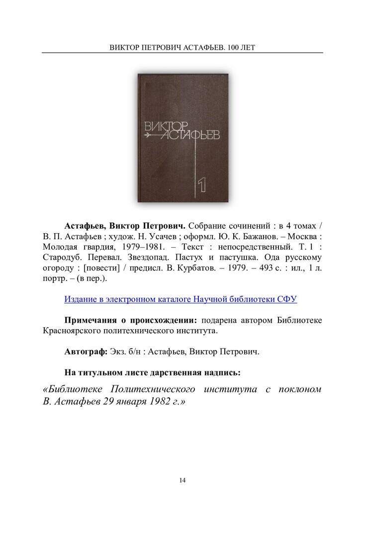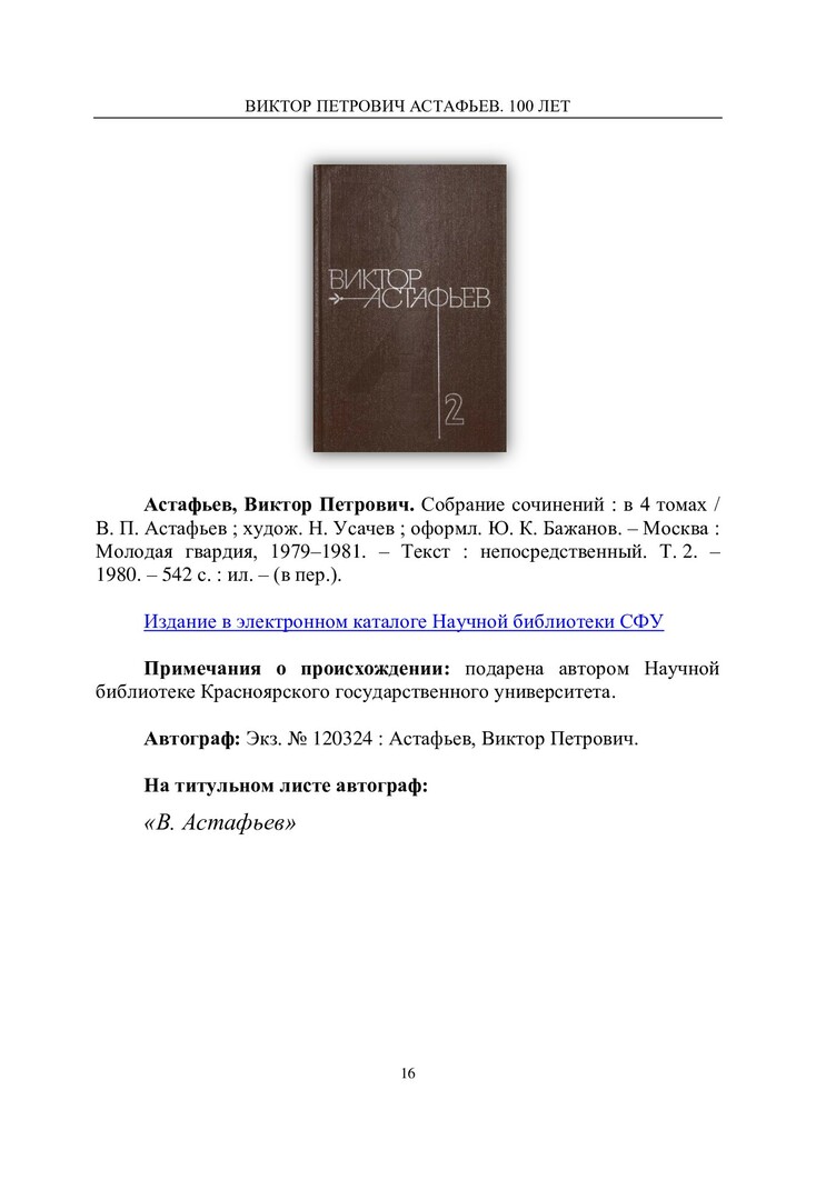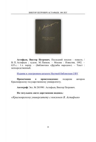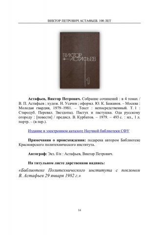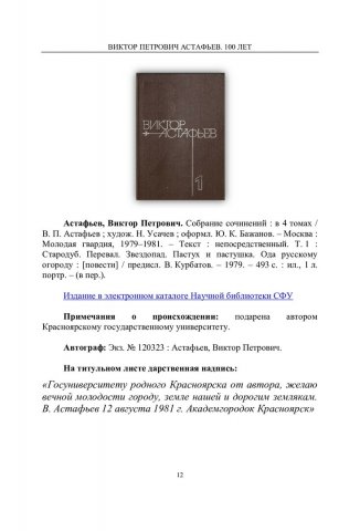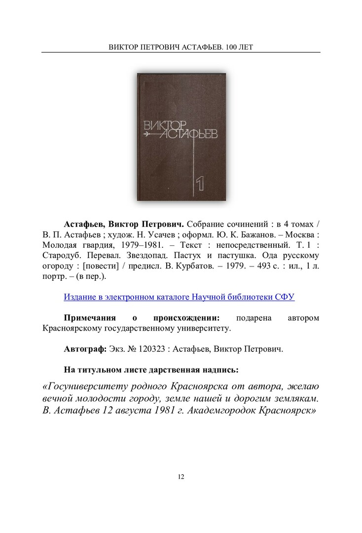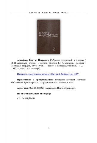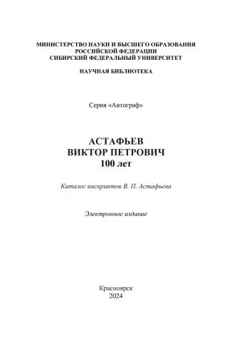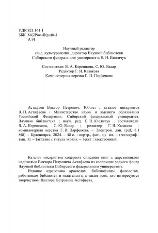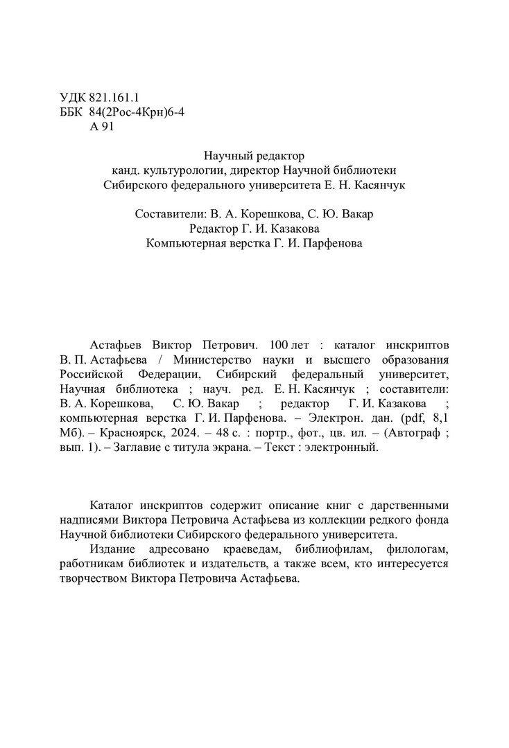 Библиографическое описание: Астафьев Виктор Петрович. 100 лет : каталог инскриптов В. П. Астафьева / Сибирский федеральный университет, Научная библиотека ; науч. ред. Е. Н. Касянчук ; сост.: В. А. Корешкова, С. Ю. Вакар ; ред. Г. И. Казакова. - Электрон. дан. (pdf, 8,1 Мб). - Красноярск : [б. и.], 2024. - 48 с. : портр., фот., цв. ил. - (Автограф ; вып. 1). - Загл. с титул. экрана. - Б. ц. - Текст : электронный.