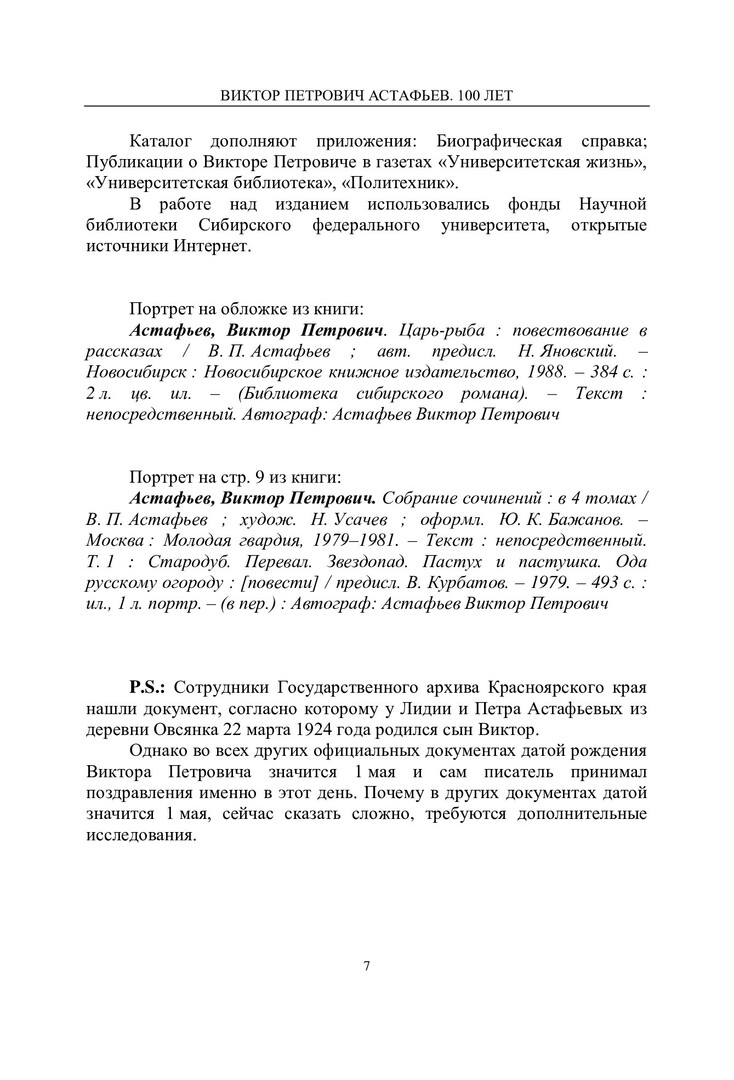 Астафьев Виктор Петрович. 100 лет : каталог инскриптов В. П. Астафьевабиблиография