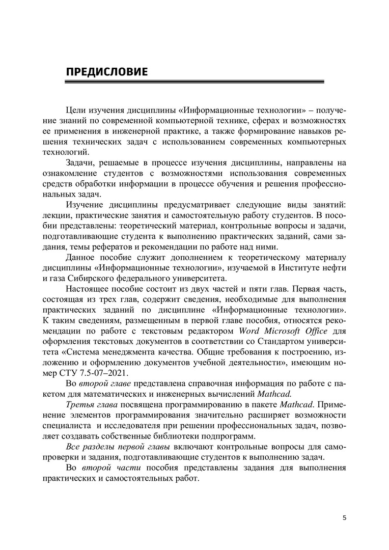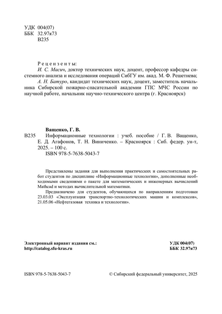 Библиографическое описание: Ващенко, Галина Вадимовна. Информационные технологии : учебное пособие / Г. В. Ващенко, Е. Д. Агафонов, Т. Н. Виниченко ; рец.: И. С. Масич, А. Н. Батуро ; Сибирский федеральный университет, Институт нефти и газа. - Электрон. текстовые дан. (pdf, 8.6 Мб). - Красноярск : СФУ, 2025 (2025-10-09). - 100 с., 6.3 усл. печ. л. : цв. ил. - Загл. с титул. экрана. - Электрон. версия печ. публикации . - Библиогр.: с. 99. - 100 экз. - ISBN 978-5-7638-5043-7 : Б. ц. - Изд. № 2024-22606. - Текст : электронный.