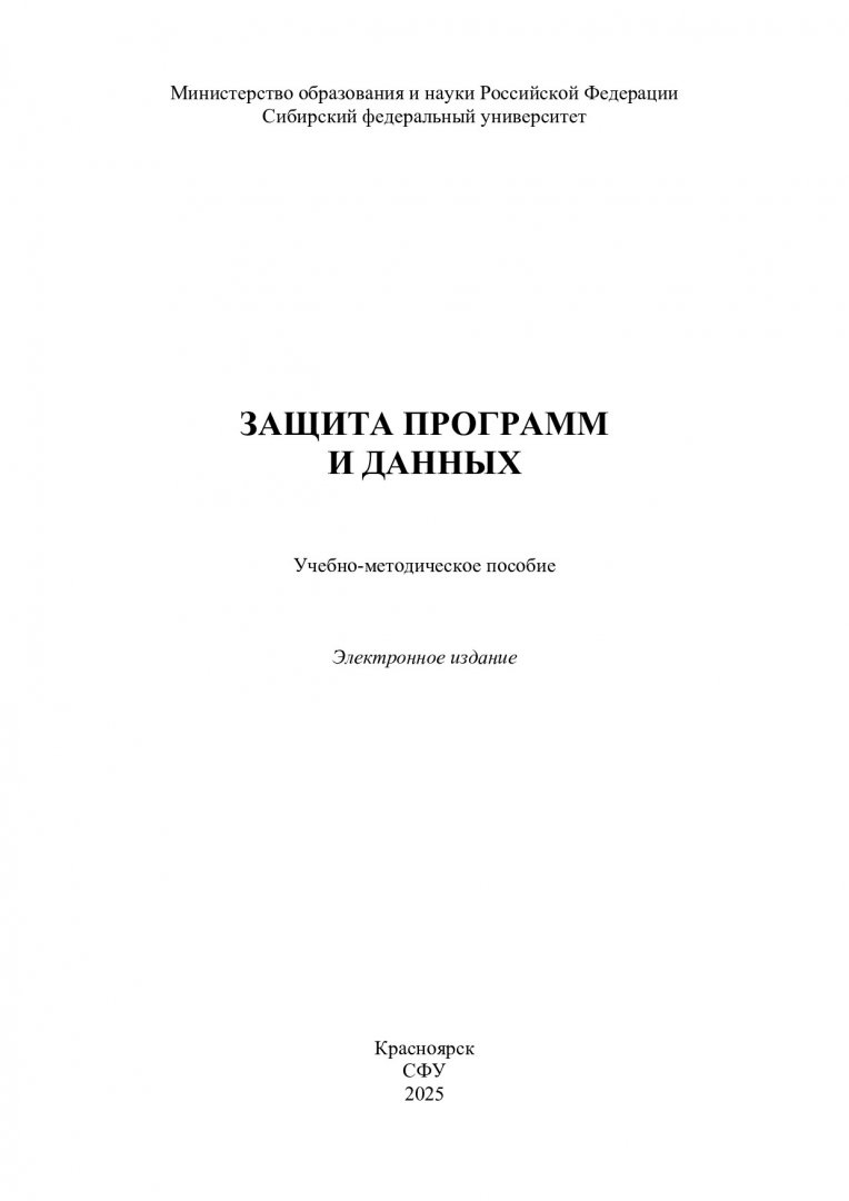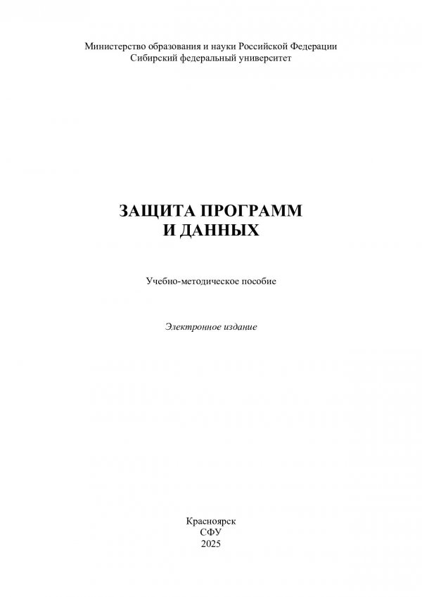 Библиографическое описание: Защита программ и данных : учебно-методическое пособие / Сибирский федеральный университет, Институт космических и информационных технологий ; сост.: А. Н. Шниперов, Р. С. Шиманович, О. В. Рубцова, А. К. Зырянова. - Электрон. текстовые дан. (pdf, 1.9 Мб). - Красноярск : СФУ, 2025 (2025-06-21). - 89 с. - Загл. с титул. экрана. - Библиогр.: с. 88. - Изд. № 2025-25661 : Б. ц. - Текст : электронный.