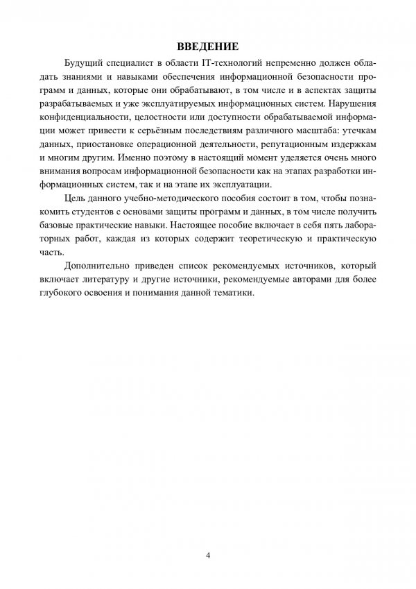 Аннотация: Содержатся методические указания к лабораторному практикуму, включающие в себя краткие теоретические сведения, описание и порядок выполнения пяти лабораторных работ по базовым основам защиты программ и данных. Предназначено студентов и магистрантов дневной и заочных форм обучения, обучающихся по направлениям подготовки и специальностям в области информационных технологий. Кроме этого, может быть полезно студентам других специальностей, изучающим вопросы обеспечения информационной безопасности, а также слушателям курсов повышения квалификации.