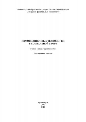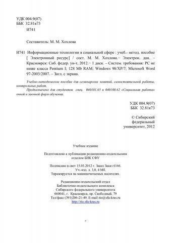 Библиографическое описание:Информационные технологии в социальной сфере : учеб.-метод. пособие для студентов спец. спец. 040101.65 и 040100.62 / Сиб. федерал. ун-т ; сост. М. М. Хохлова. - Электрон. текстовые дан. (PDF, 1,37 Кб). - Красноярск : Сиб. федер. ун-т, 2012. - Загл. с титул. экрана. - Библиогр.: с. 35-38. - Текст : электронный.