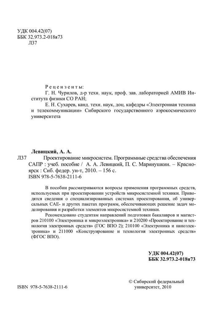 Библиографическое описание: Левицкий, Алексей Александрович. Проектирование микросистем. Программные средства обеспечения САПР : учеб. пособие / А. А. Левицкий, П. С. Маринушкин ; Сиб. федер. ун-т. - Красноярск : СФУ, 2010. - 156 с. : граф., рис., табл. - Библиогр.: с. 148-154. - 100 экз. - ISBN 978-5-7638-2111-6. - Текст : непосредственный : электронный.