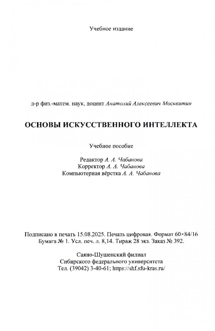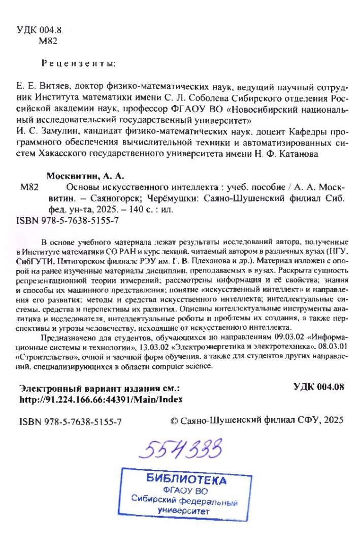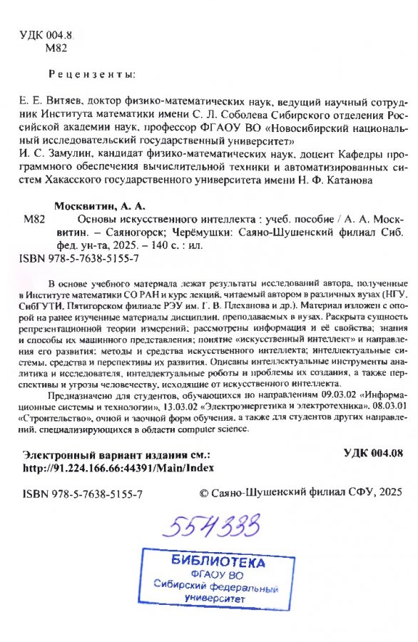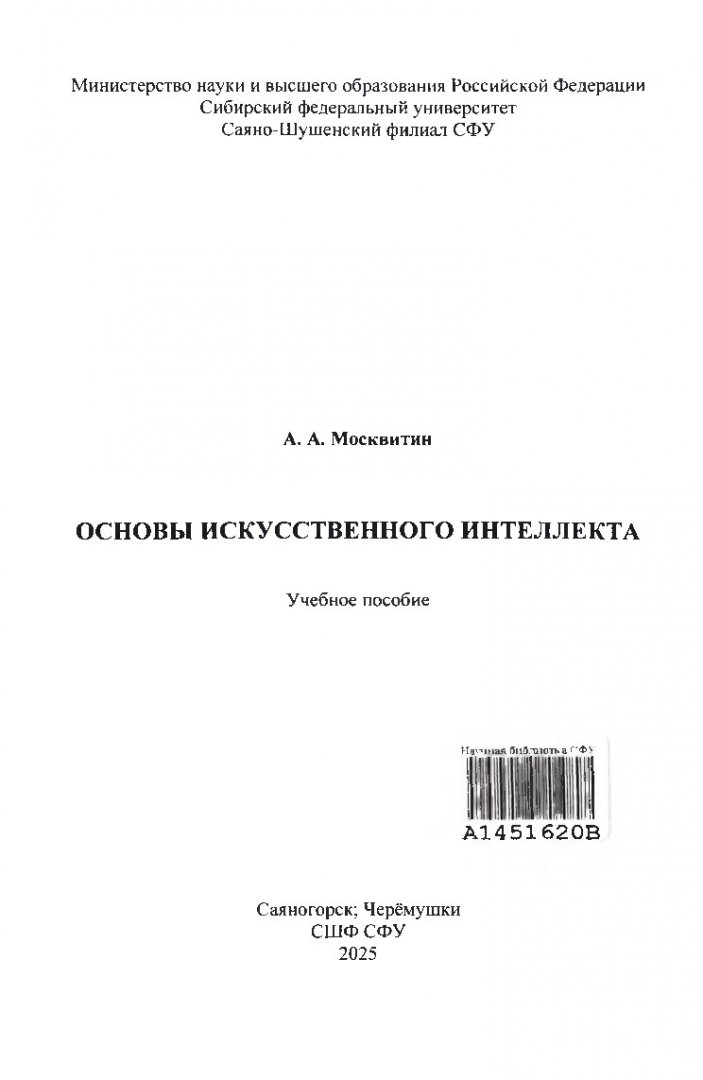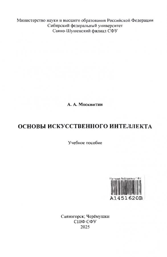 Библиографическое описание: Москвитин, Анатолий Алексеевич. Основы искусственного интеллекта : учебное пособие / А. А. Москвитин ; [рец.: Е. Е. Витяев, И. С. Замулин] ; Сибирский федеральный университет, Саяно-Шушенский филиал. - Саяногорск ; Черёмушки : СШФ СФУ, 2025 (2025-08-15). - 139 с., 8,14 усл. печ. л. : ил., цв. ил., табл. - Библиогр.: с. 112-115. - 28 экз. - ISBN 978-5-7638-5155-7 : 130.20 р. - Текст : непосредственный.