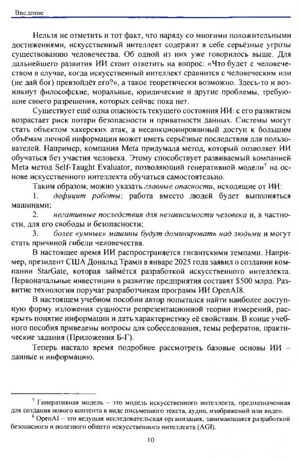 Аннотация: В основе учебного материала лежат результаты исследований автора, полученные в Институте математики СО РАН и курс лекций, читаемый автором в различных вузах (НГУ. СибГУТИ, Пятигорском филиале РЭУ им. Г. В. Плеханова и др.). Материал изложен с опорой на ранее изученные материалы дисциплин, преподаваемых в вузах. Раскрыта сущность репрезентационной теории измерений: рассмотрены информация и её свойства; знания и способы их машинного представления; понятие «искусственный интеллект» и направления его развития: методы и средства искусственного интеллекта; интеллектуальные системы, средства и перспективы их развития. Описаны интеллектуальные инструменты аналитика и исследователя, интеллектуальные роботы и проблемы их создания, а также перспективы и угрозы человечеству, исходящие от искусственного интеллекта. Предназначено для студентов, обучающихся по направлениям 09.03.02 «Информационные системы и технологии», 13.03.02 «Электроэнергетика и электротехника». 08.03.01 «Строительство», очной и заочной форм обучения, а также для студентов других направлений, специализирующихся в области computer science.