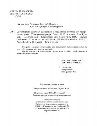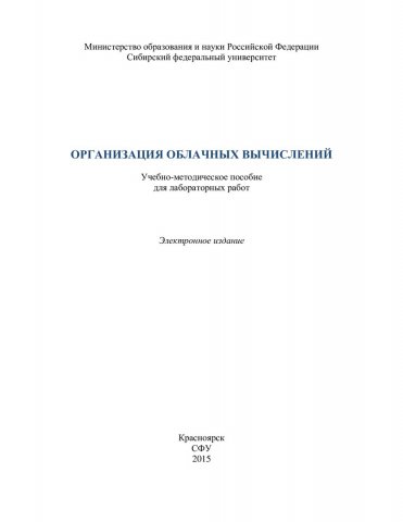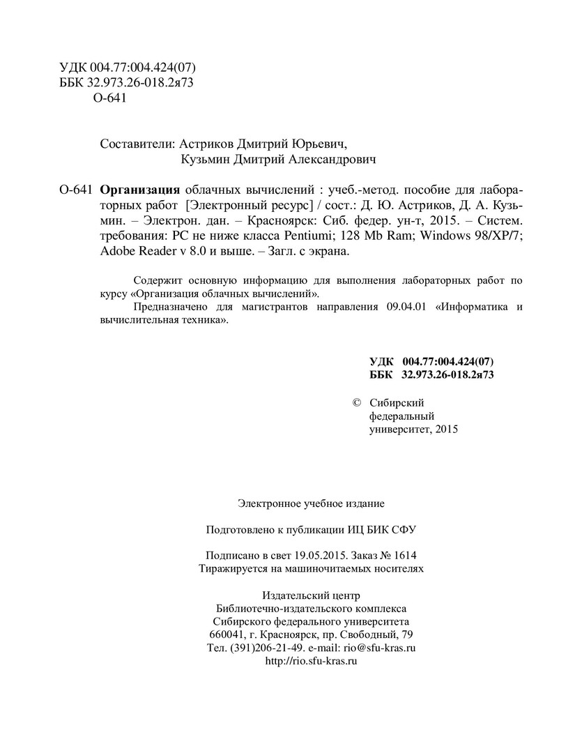 Библиографическое описание:Организация облачных вычислений : учеб.-метод. пособие для лабораторных работ [для магистрантов напр. 09.04.01 «Информатика и вычислительная техника».] / Сиб. федер. ун-т, Ин-т космич. и информ. технологий ; сост.: Д. Ю. Астриков, Д. А. Кузьмин. - Электрон. текстовые дан. (PDF, 991 Кб). - Красноярск : СФУ, 2015. - Загл. с титул. экрана. - Изд. № 2015-1614. - Текст : электронный.