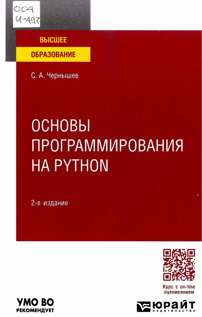 Библиографическое описание:Чернышев, Станислав Андреевич. Основы программирования на Python : учебное пособие для студентов вузов, обучающихся по IT направлениям / С. А. Чернышев ; [рец.: А. В. Гордеев, С. И. Штеренберг]. - 2-е изд., перераб. и доп. - Москва : Юрайт, 2024. - 348 с. : ил. - (Высшее образование). - Библиогр.: с. 345-349. - ISBN 978-5-534-17139-6 (в пер.) : 645.65 р. - Текст : непосредственный. На тит. с. в подзаг.: Курс с практическими заданиями и дополнительными материалами доступен на образовательной платформе "Юрайт", а также в мобильном приложении "Юрайт.Библиотека"