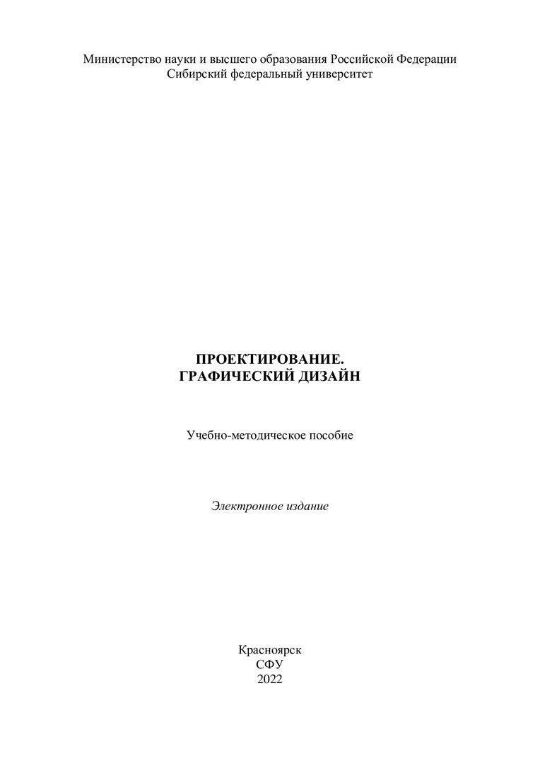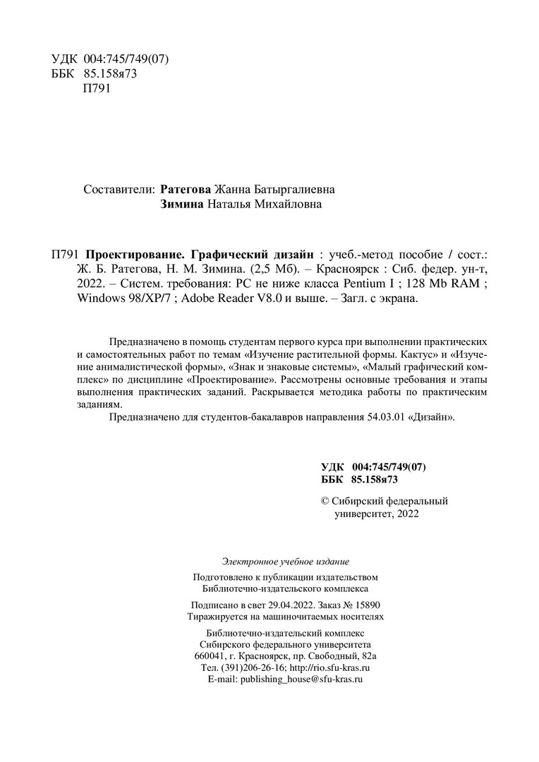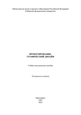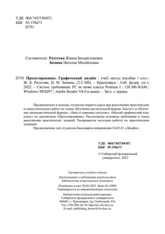 Библиографическое описание: Проектирование. Графический дизайн : учебно-методическое пособие / Сиб. федер. ун-т, Ин-т архитектуры и дизайна ; сост.: Ж. Б. Ратегова, Н. М. Зимина. - Электрон. текстовые дан. (pdf, 4,8 Мб). - Красноярск : СФУ, 2022 (2022-03-23). - 46 с. - Загл. с титул. экрана. - Изд. № 2022-15889 : Б. ц. - Текст : электронный.