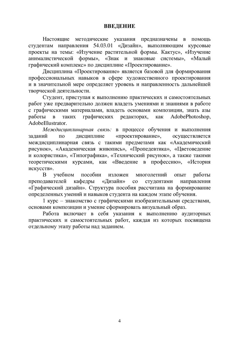Аннотация: Предназначено в помощь студентам первого курса при выполнении практических и самостоятельных работ по темам «Изучение растительной формы. Кактус» и «Изучение анималистической формы», «Знак и знаковые системы», «Малый графический комплекс» по дисциплине «Проектирование». Рассмотрены основные требования и этапы выполнения практических заданий. Раскрывается методика работы по практическим заданиям. Предназначено для студентов-бакалавров направления 54.03.01 «Дизайн».