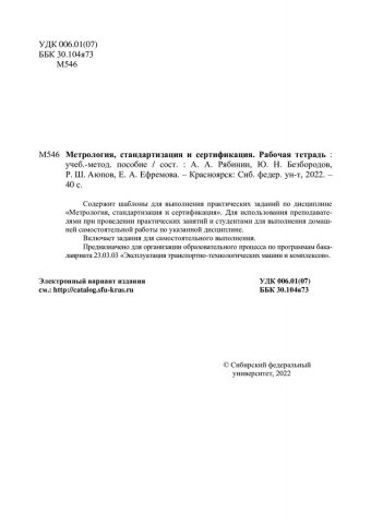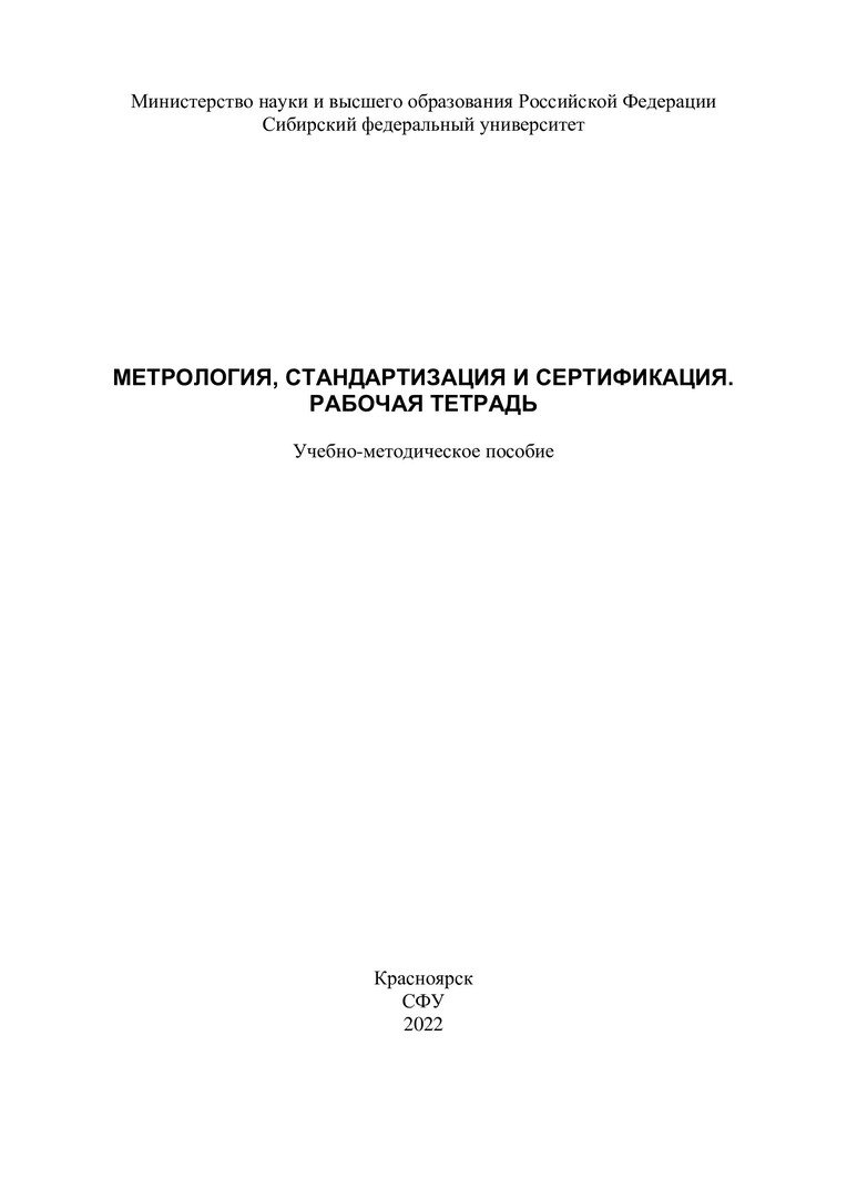 Библиографическое описание: Метрология, стандартизация и сертификация. Рабочая тетрадь : учебно-методическое пособие / Сиб. федер. ун-т ; сост. А. А. Рябинин [и др.]. - Электрон. текстовые дан. (pdf; 1.00 Мб). - Красноярск : СФУ, 2022 (2022-04-27). - 40 с., 2.0 усл. печ. л. - Загл. с титул. экрана. - Электрон. версия печ. публикации . - Библиогр.: с. 36. - 100 экз. - Изд. № 2022-16107 : Б. ц. - Текст : электронный.