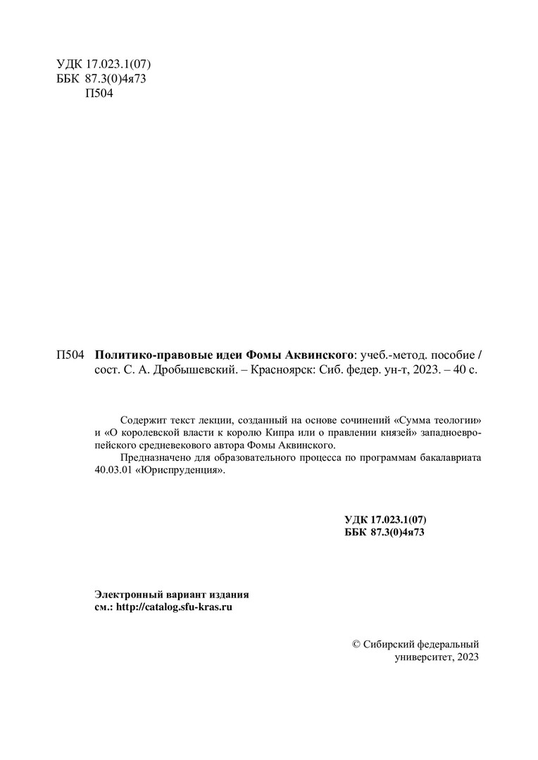 Библиографическое описание: Политико-правовые идеи Фомы Аквинского : учебно-методическое пособие / Сибирский федеральный университет, Юридический институт ; сост. С. А. Дробышевский. - Электрон. текстовые дан. (1,5 Мб). - Красноярск : СФУ, 2023 (2023-04-21). - 40 с. - Загл. с титул. экрана. - Электрон. версия печ. публикации . - Библиогр.: с. 37. - 100 экз. - Изд. № 2023-18819 : Б. ц. - Текст : электронный.