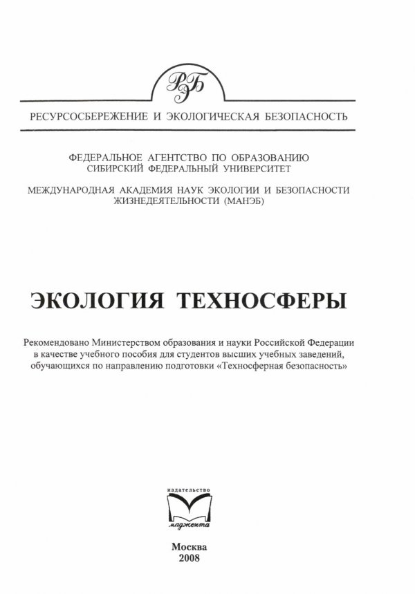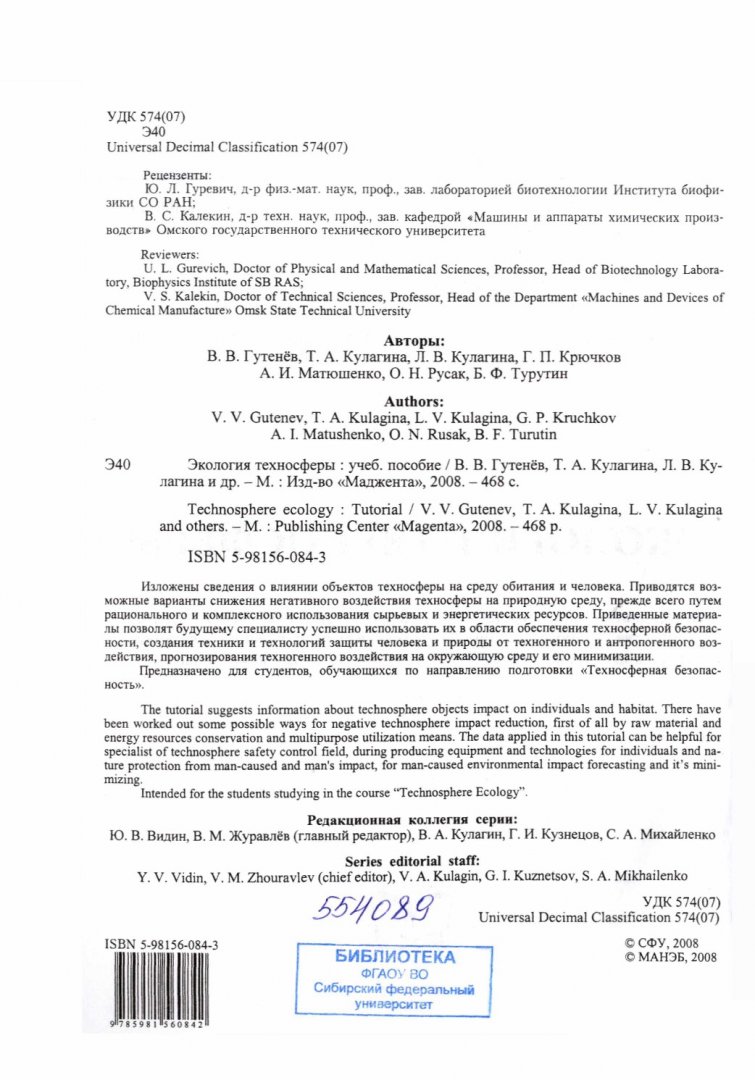 Библиографическое описание: Экология техносферы = Technosphere ecology : учебное пособие для студентов вузов, обучающихся по направлению подготовки "Техносферная безопасность" / В. В. Гутенев, Т. А. Кулагина, Л. В. Кулагина [и др.] ; Сиб. федер. ун-т, Междунар. акад. наук экологии и безопасности жизнедеятельности. - Москва : Маджента, 2008. - 468 с. : ил., табл. - (Ресурсосбережение и экологическая безопасность : РЭБ). - Авт. указаны на обороте тит. л. - Рез. англ. - Библиогр.: с. 464-465. - 1000 экз. - ISBN 5-98156-084-3 (в пер.) : 468.00 р., 400 р. - Текст : непосредственный. Автограф: Экз. 554089 : Матюшенко, Анатолий Иванович