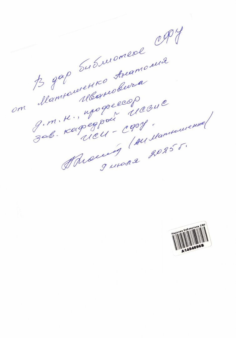 Автограф: «В дар библиотеке СФУ от Матюшенко А. И., д.т.н., зав кафедрой ИСЗиС ИСИ - СФУ. 9 июля 2025 г. », Матюшенко Анатолий Иванович