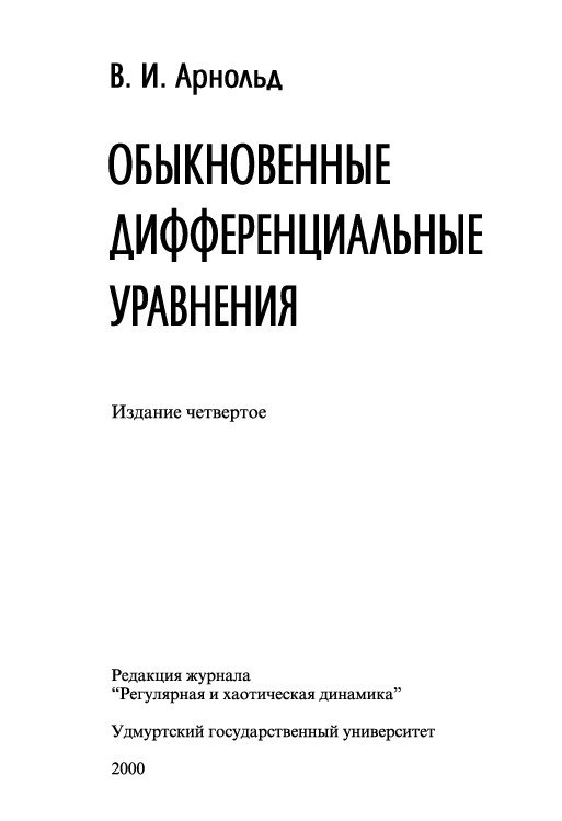 Библиографическое описание:Арнольд, Владимир Игоревич. Обыкновенные дифференциальные уравнения : учебное пособие для механико-математических специальностей вузов / В. И. Арнольд. - 4-е изд. - Ижевск : [R&C Dynamics] Регулярная и хаотическая динамика [РХД] : Удмуртский университет, 2000. - Б. ц. - Текст : электронный. Электронная версия печатного издания. Формат: PDF (Adobe Acrobat Reader); Размер: 21Мб; Доступ: локальная сеть СФУ