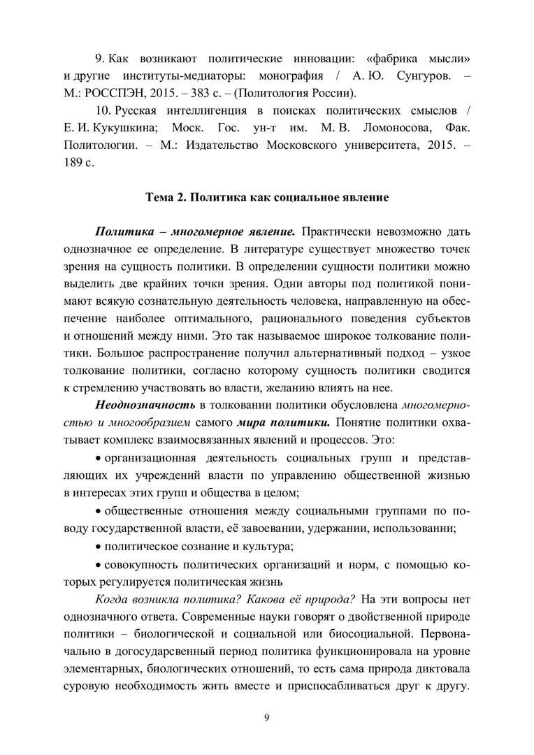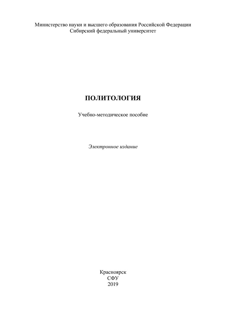 Библиографическое описание: Политология : учебно-методическое пособие / Сибирский федеральный университет, Гуманитарный институт ; сост. А. С. Жулаева. - Электрон. текстовые дан. (pdf, 0,8 Мб). - Красноярск : СФУ, 2019. - 80 с. - Загл. с титул. экрана. - Библиогр.: с. 78-80. - Изд. № 2019-9095 : Б. ц. - Текст : непосредственный.