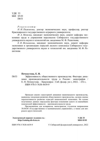 Библиографическое описание: Почекутова, Елена Николаевна. Эффективность общественного производства. Факторы динамики производительности труда в России : монография / Е. Н. Почекутова ; Сибирский федеральный университет, Институт экономики, государственного управления и финансов. - Электрон. текстовые дан. (6,9 Мб). - Красноярск : СФУ, 2022 (2022-01-15). - 232 с., 15.5 усл. печ. л. - Загл. с титул. экрана. - Электрон. версия печ. публикации . - На обл. авт. не указан. Авт. указан в выходных данных. - Библиогр.: с. 185-190. - 500 экз. - ISBN 978-5-7638-4439-9 : Б. ц. - Изд. № 2020-12548. - Текст : электронный.