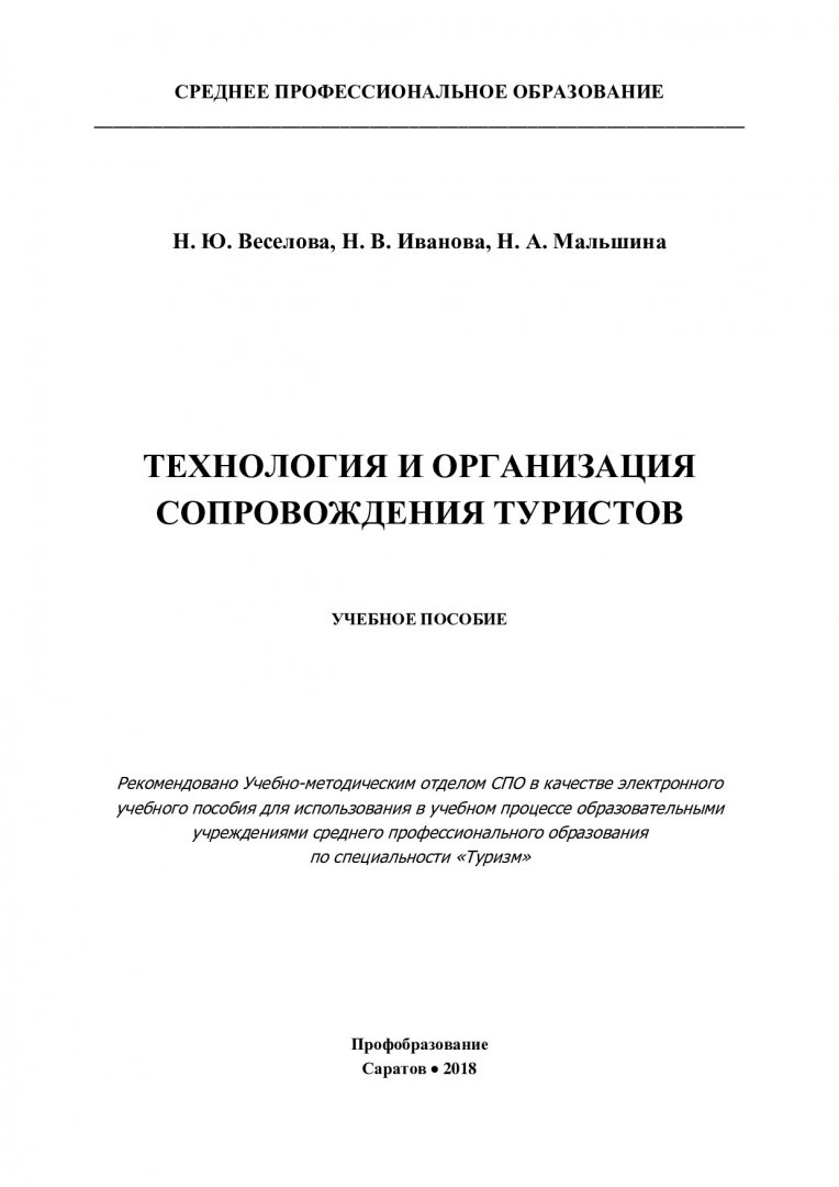 Библиографическое описание:Веселова, Н. Ю. Технология и организация сопровождения туристов : Учебное пособие для СПО / Н. Ю. Веселова, Н. В. Иванова, Н. А. Мальшина. - Саратов : Профобразование, 2018. - ISBN 978-5-4488-0191-4 : Б. ц. - Текст : непосредственный. Книга находится в премиум-версии ЭБС IPR BOOKS.
