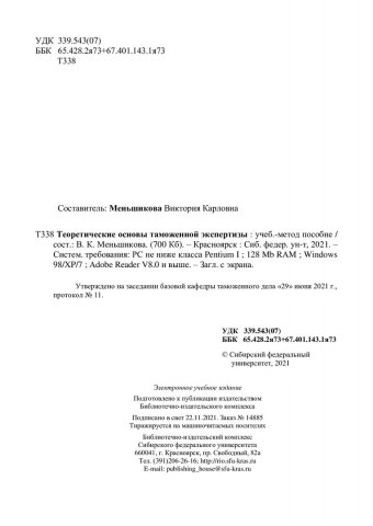 Библиографическое описание:Теоретические основы таможенной экспертизы : учебно-методическое пособие / Сибирский федеральный университет, Институт торговли и сферы услуг ; сост. В. К. Меньшикова. - Электрон. текстовые дан. (pdf, 0,7 Мб). - Красноярск : СФУ, 2021 (2021-10-28). - 10 с. - Загл. с титул. экрана. - Изд. № 2021-14885 : Б. ц. - Текст : электронный.