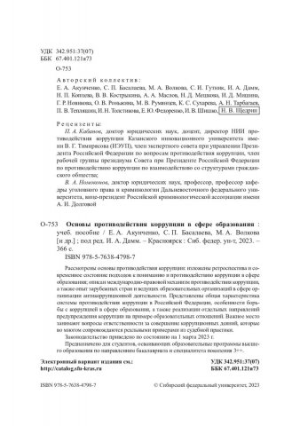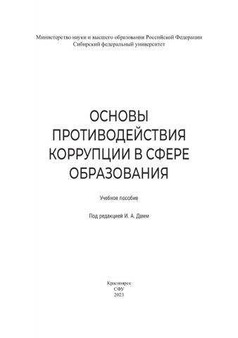 Библиографическое описание: Основы противодействия коррупции в сфере образования : учебное пособие / Е. А. Акунченко, С. П. Басалаева, М. А. Волкова [и др.] ; под ред. И. А. Дамм ; [рец.: П. А. Кабанов, В. А. Номоконов] ; Сибирский федеральный университет, Юридический институт. - Красноярск : СФУ, 2023 (2023-09-19). - 366 с., 23.0 усл. печ. л. - Авт. указ. на обороте тит. л. - Библиогр.: с. 354-361. - 100 экз. - ISBN 978-5-7638-4798-7 (в пер.) : 340.38 р. - Изд. № 2023-18177. - Текст : электронный + Текст : непосредственный.